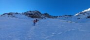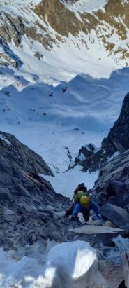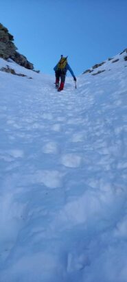 neve nel canale non durissima, ma ben gradinata. ultimo passaggio le picozze sono d'intralcio (arrampicata semplice ma su appigli non solidissimi) per il rientro occhio alle lastre…