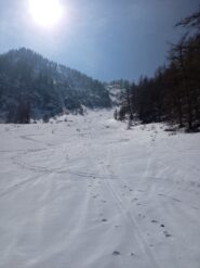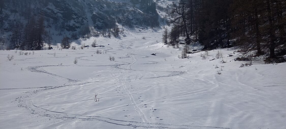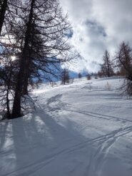 Salito con gli sci fino in cima senza rampanti e senza mai toglierli. In discesa veramente di tutto, fino al colle il vento ha fatto disastri…