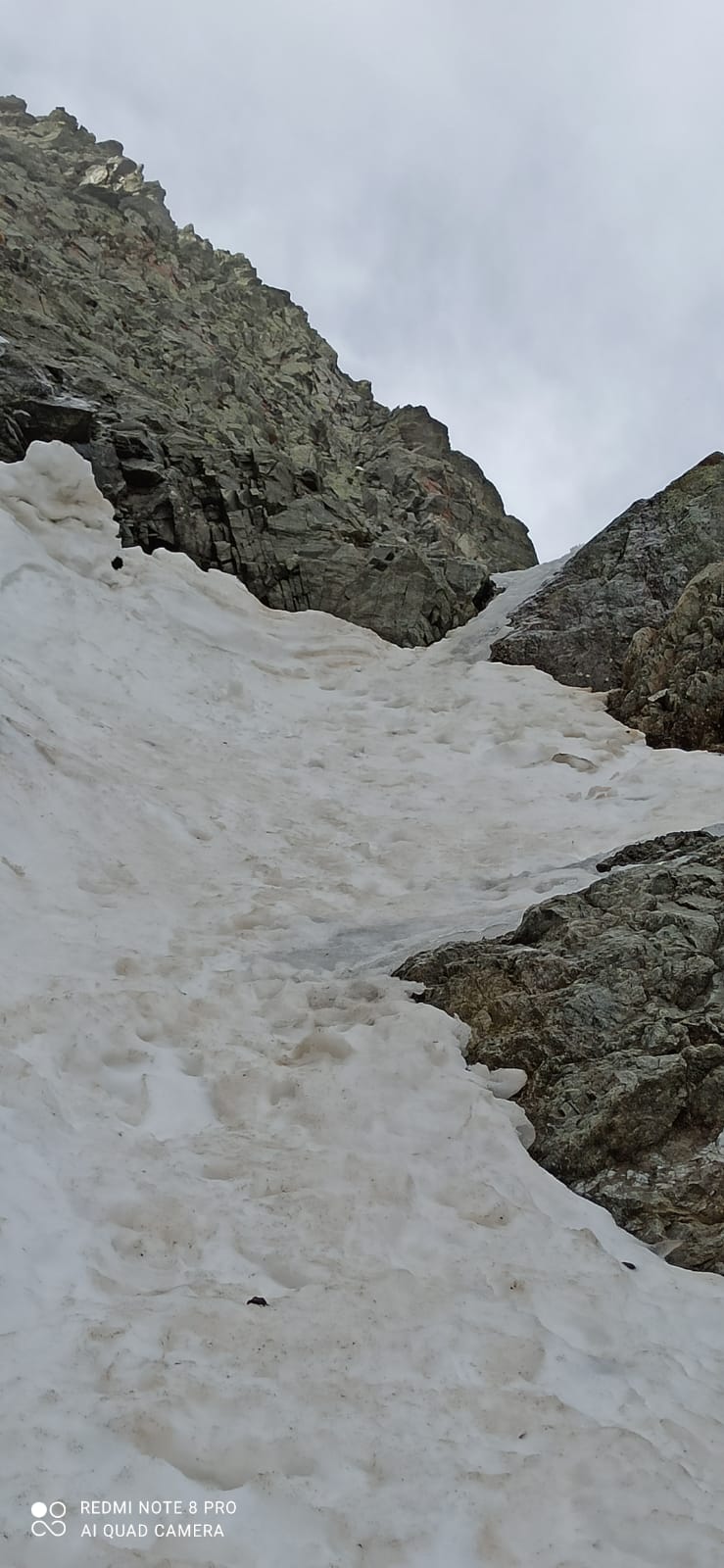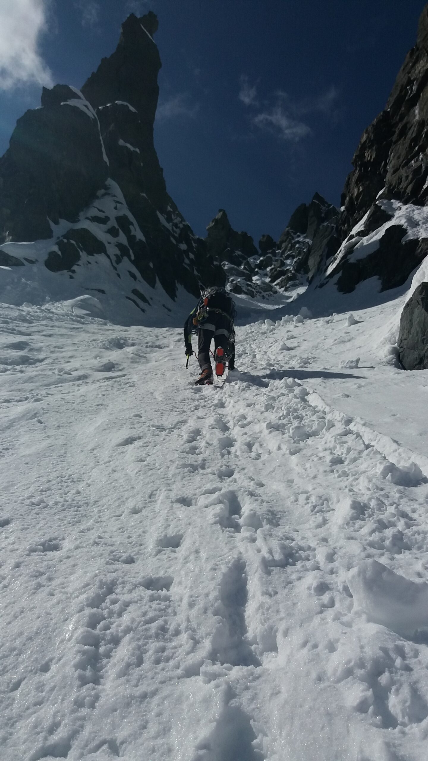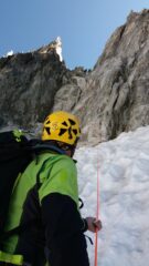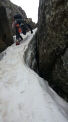 Il canale è in ottime condizioni fino a circa 15 mt dall’uscita, dove la neve non ancora trasformata rende la progressione piuttosto faticosa. Dal nevaio…