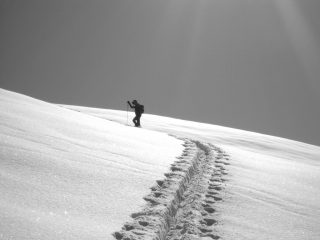 Parte bassa: siamo saliti sul versante est della cresta mantenendoci su una dorsale appena accennata. la neve qui non è sicura. Non fatevi ingannare dalle…