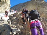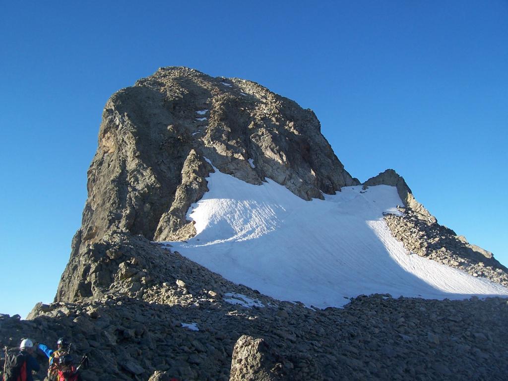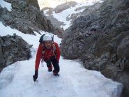 Canalino ancora in buone condizioni con uscita su roccette. Ascesa finale sino a metà su neve risalendo canalino di sx, poi tenendosi sulla sx si…