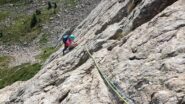 Via carina con difficoltà contenute, tuttavia mai banale data la distanza fra le protezioni. Personalmente mi sono piaciuti di più i primi due tiri. Dopo…