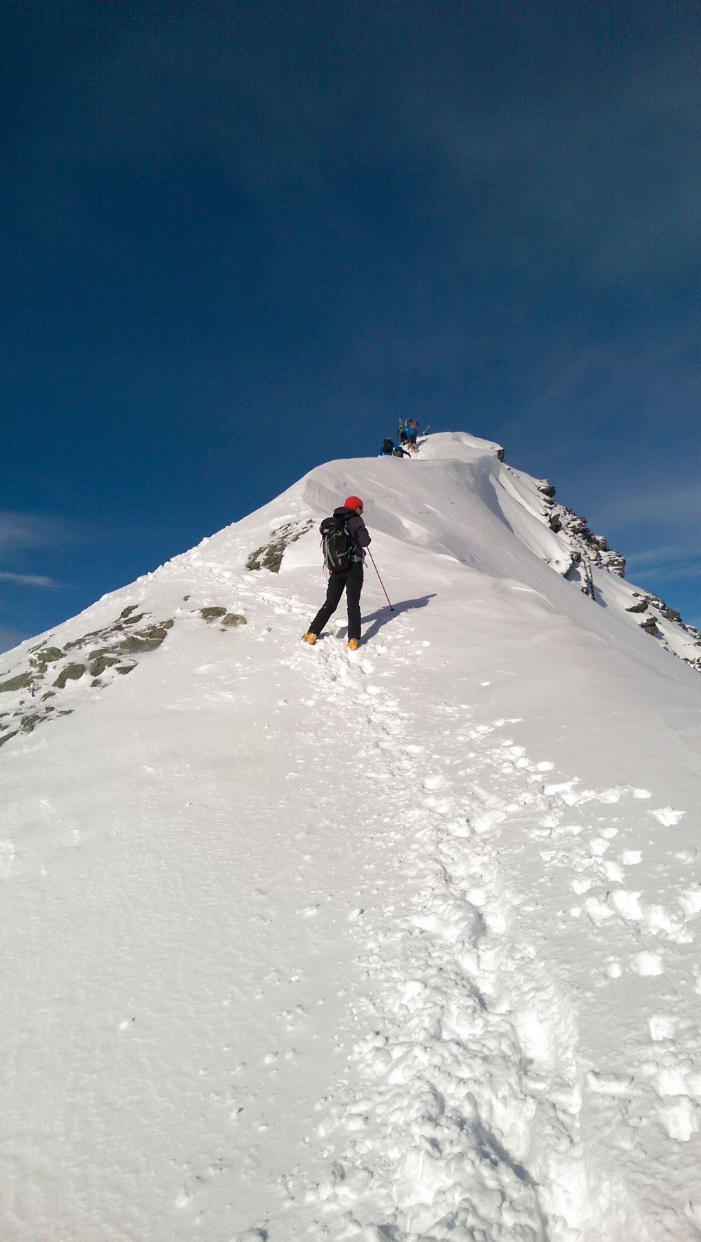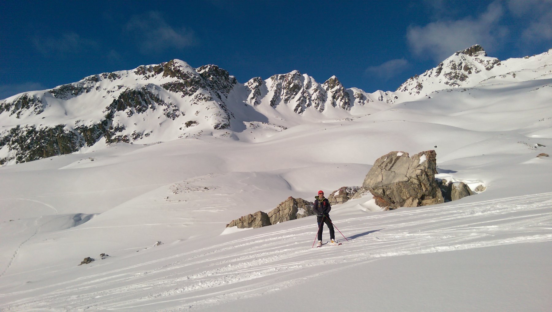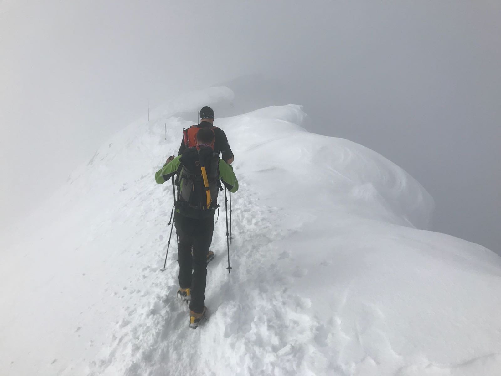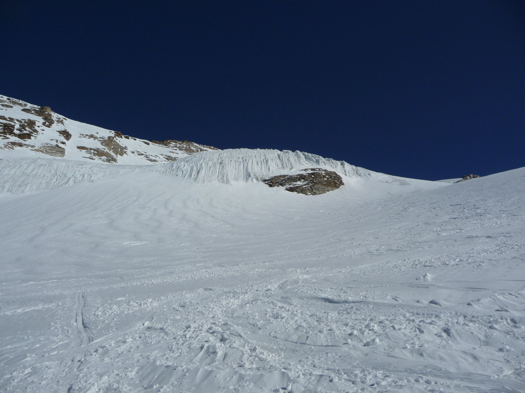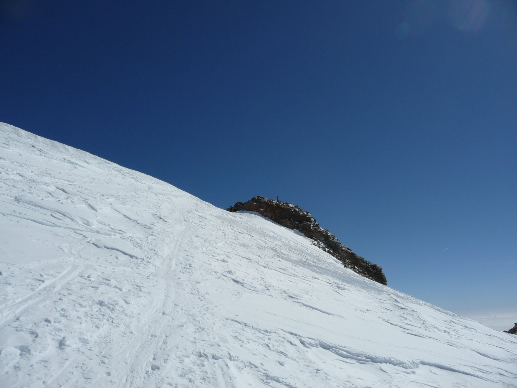 Cresta percorsa in discesa dopo aver percorso la parete Nord. Gendarmi aggirabili su neve spesso sfondosa, attenzione nei traversi. Attenzione a non smuovere materiale…