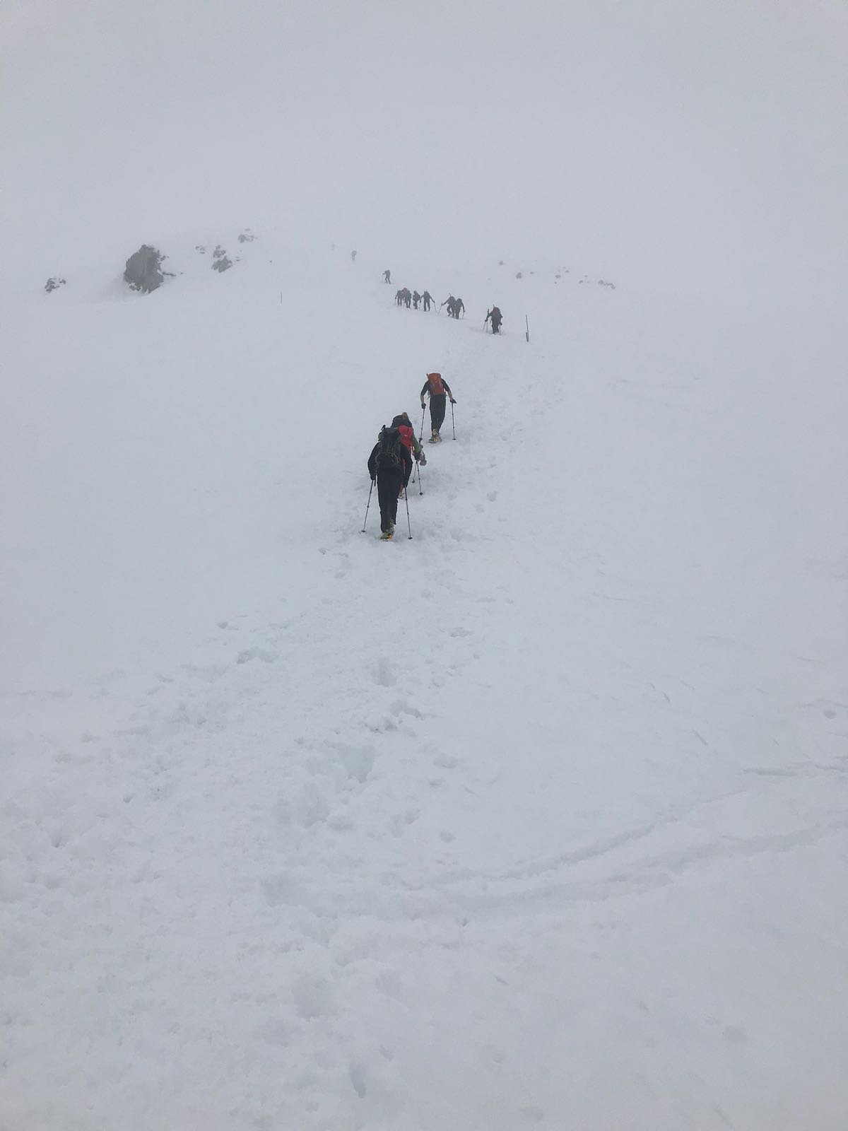 Cielo a tratti coperto, visibilità buona ma panorama in parte guastato dalle nubi basse. Per arrivare all'attacco della ferrata si percorre un tratto di nevaio…