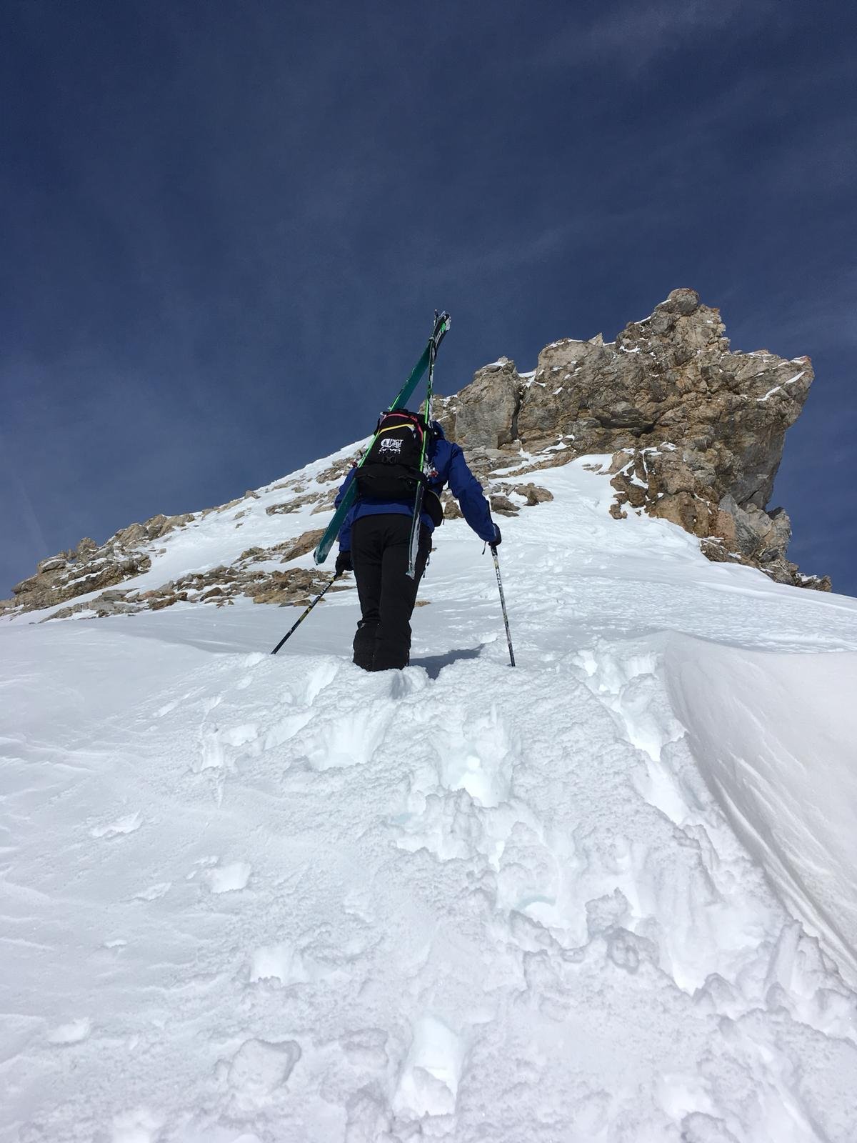 Partiti da Plateau Rosa. Gli sci si lasciano prima di affrontate la parete finale alla fine del pianoro. Neve ventata dal piccolo Cervino in avanti.…