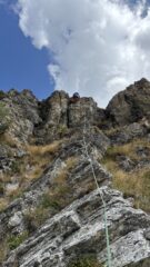 Targhetta all'inizio della corda fissa che porta alla base di L1 (corda fissa piuttosto deteriorata e sfilacciata in alto nei punti di fissaggio). Su L3…