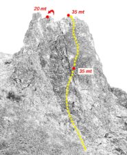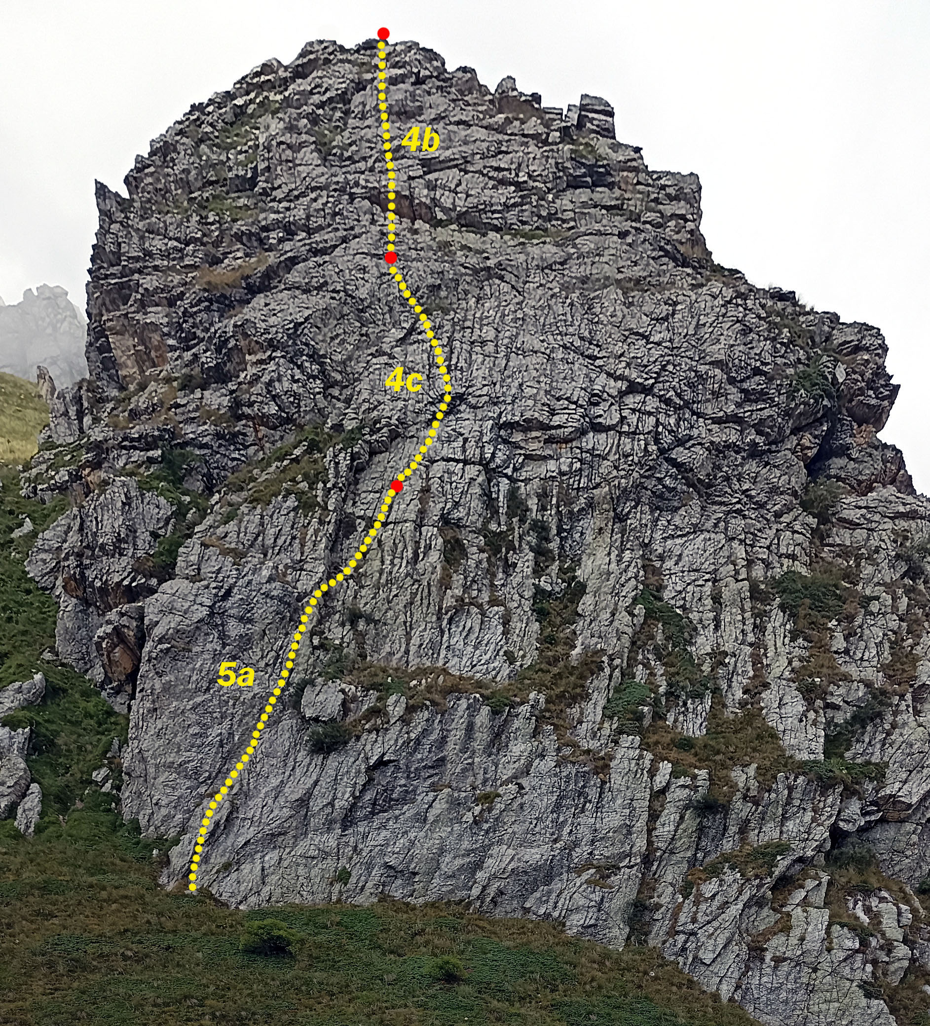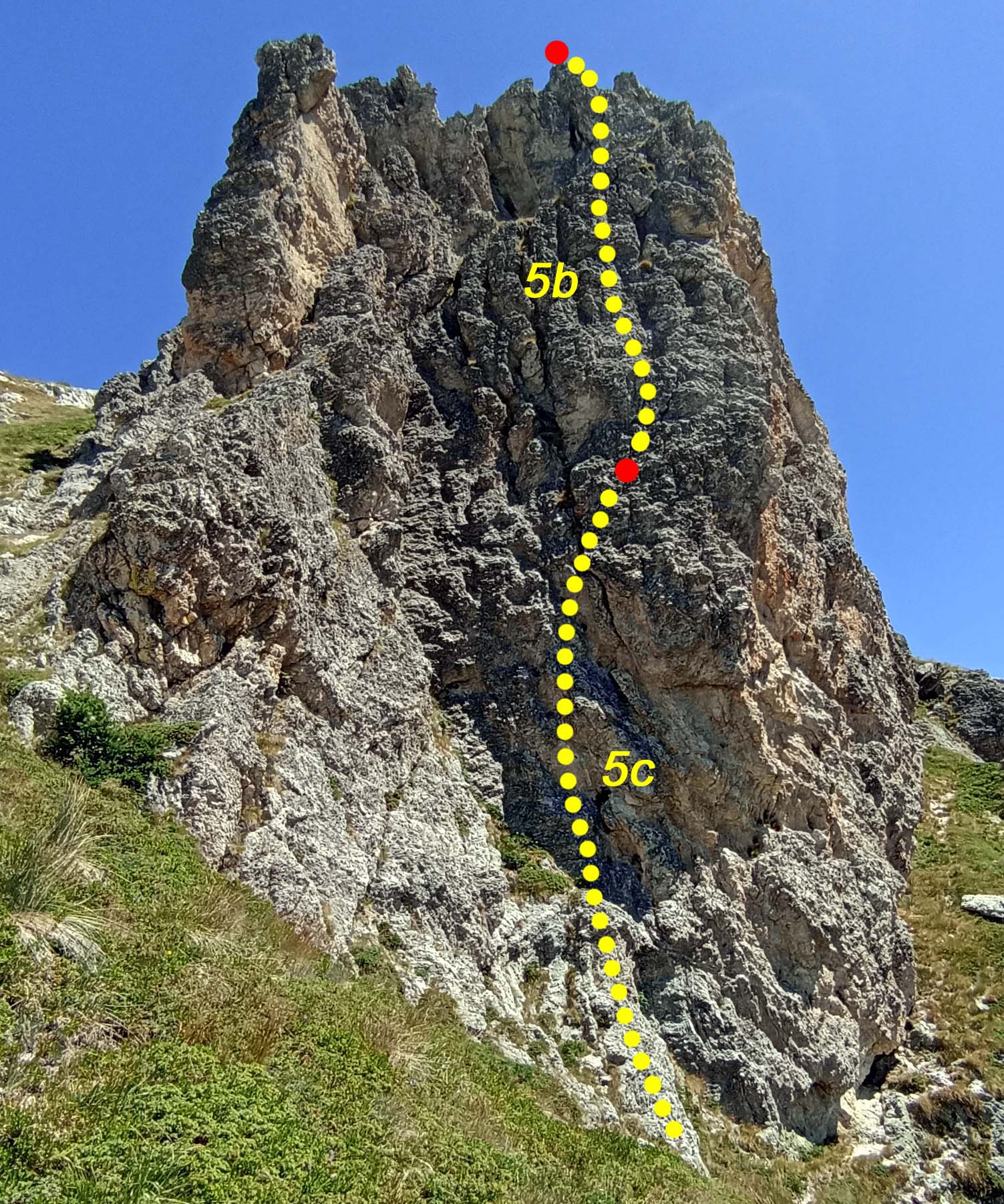 Itinerario semplice e ben protetto. Inizialmente i tiri salgono sul lato sinistro della cresta, poi viaggiano sul filo e alcuni tiri sono davvero aerei. Roccia…