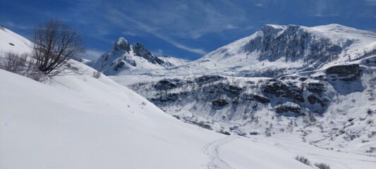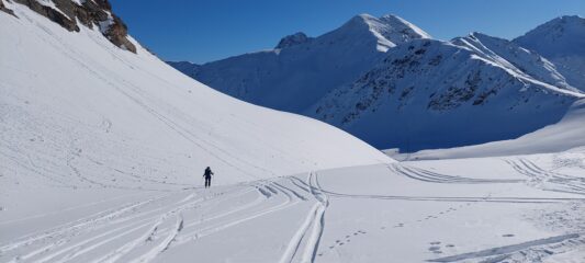 Sci ai piedi appena sopra il laghetto di Bout du col.Saliti su ottima traccia,cielo coperto,aria molto umida e totale assenza di rigelo anche nella parte…