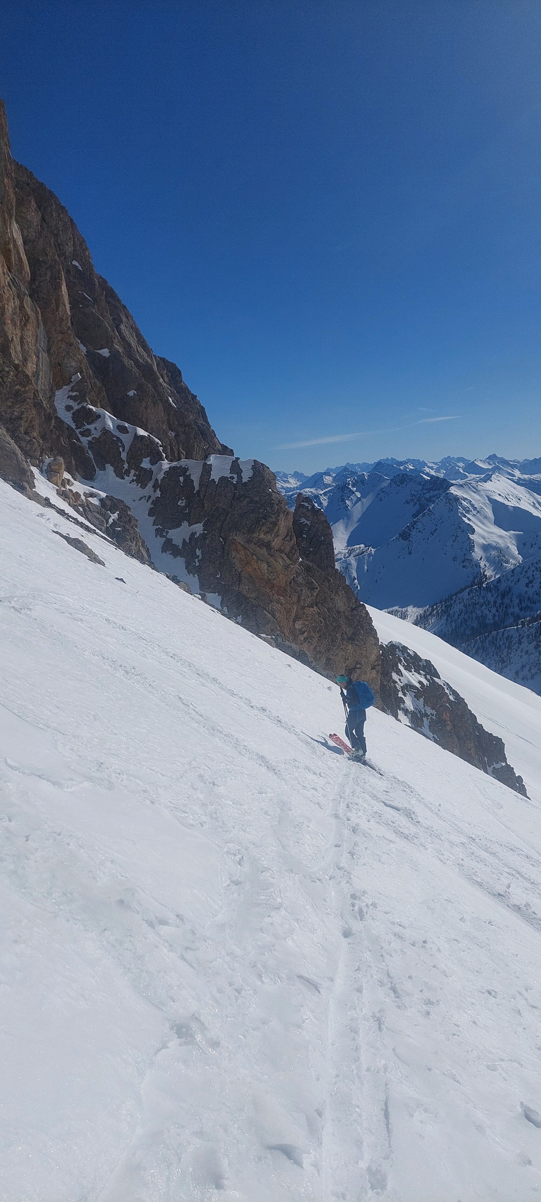 Portage fino a poco sotto il colletto clausis,potente rigelo fin da subito,ho messo i coltelli da quota 2700 in su ,la neve era durissima,arrivati in…