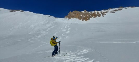 Saliti da Claviere per la val Gimont,poi abbiamo risalito gli ampi pendii sulla destra che adducono al canale est della Gimont. Risalito il canale che era…