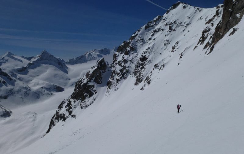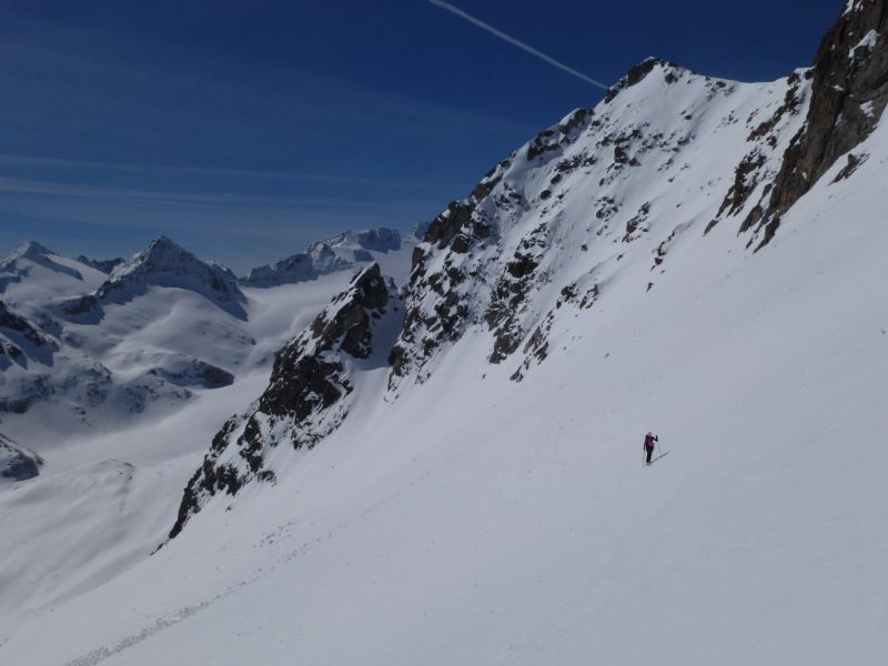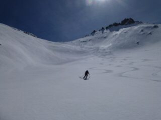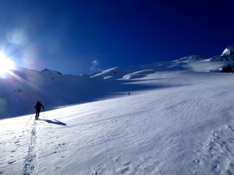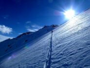 Si parte dal Tonale risalendo la Pista Paradiso che risulta battuta. Neve molto dura, rampanti molto utili. Conviene risalire il vallone a destra della pista…