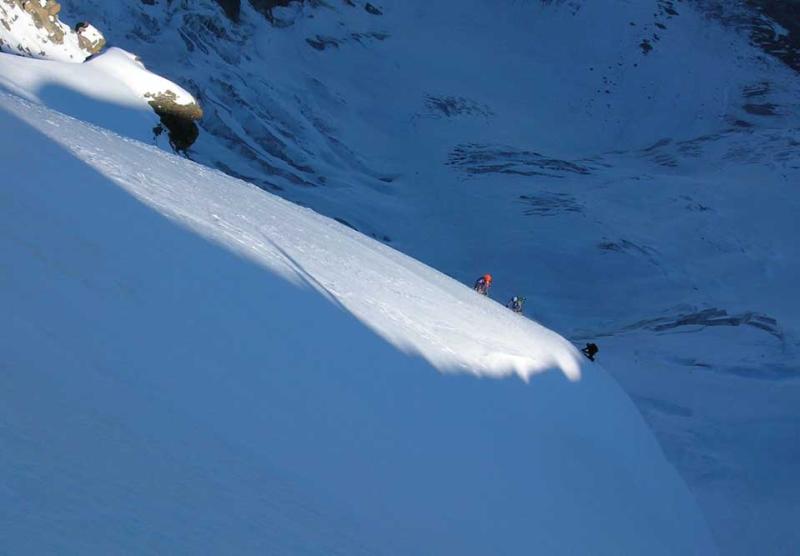 dopo la meravigliosa notte passata sotto le stelle, per il rifugio pieno, salita molto bella in condizioni, secondo me, ottime: neve abbastanza dura su tutto…