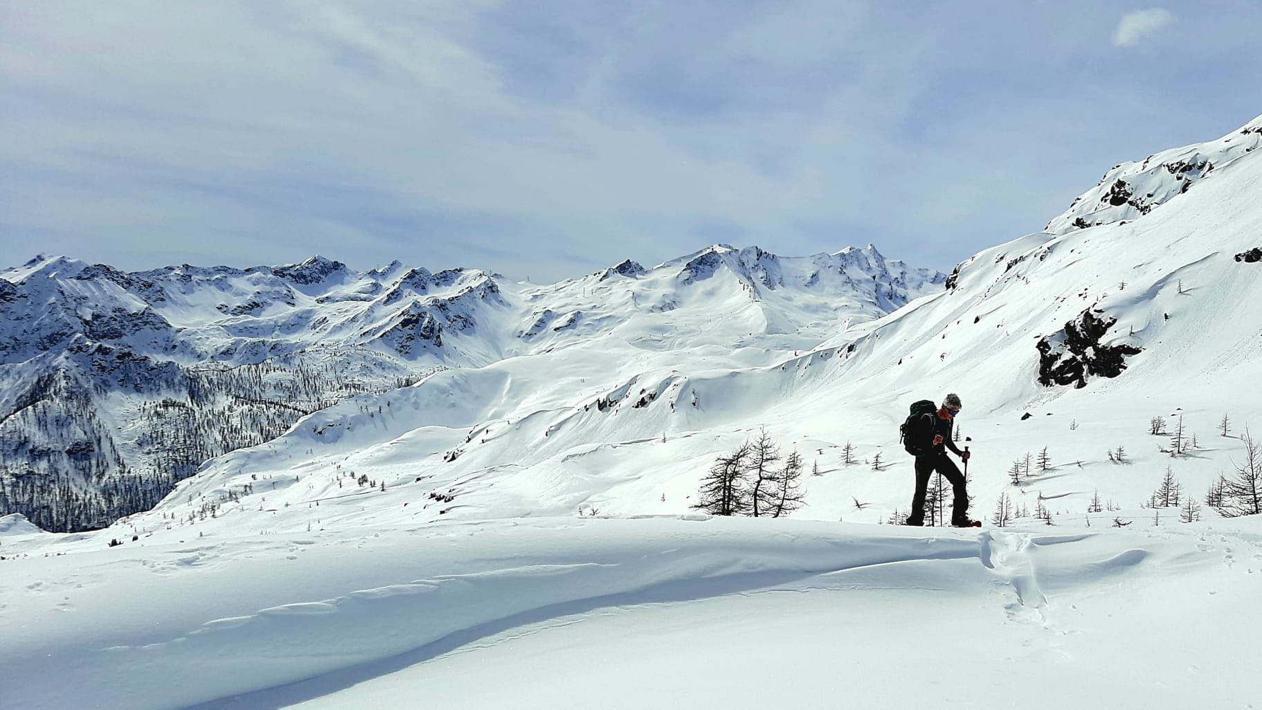 Salita iniziale lungo la pista, ai bordi, su neve bagnata e sfondosa. Meglio al colle e verso la Punta. 4-5 sci-alpinisti. Meteo super, panorama anche…