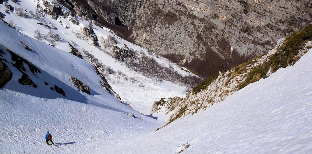 Danilo e Giuseppe, in un luogo isolato e selvaggio,scendono con i sci il Canalino Rozza nel gruppo del Velino-Sirente, Montagne della Duchessa parete nord…