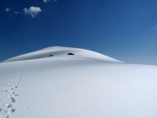 Si può salire per neve dal fondo di Pian Ciamarella, tranne un brevissimo tratto a metà del canalino finale.