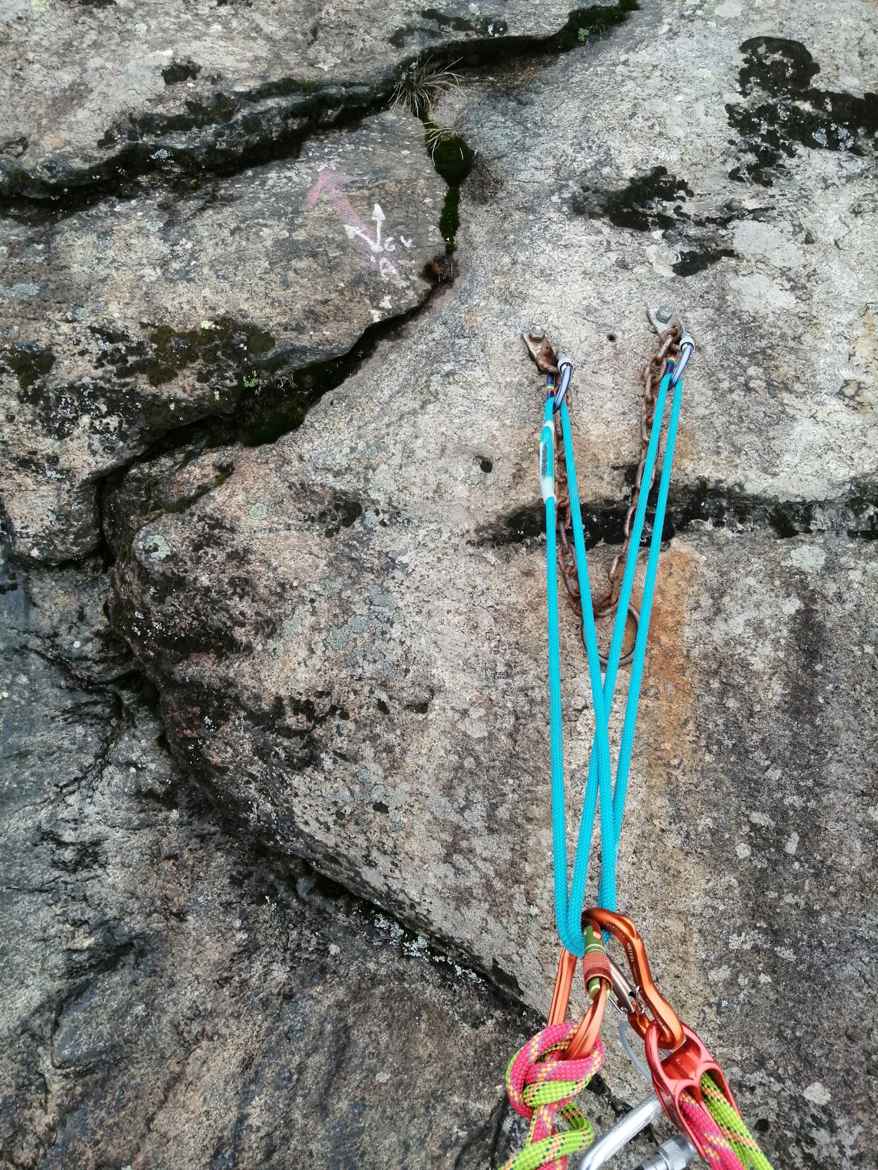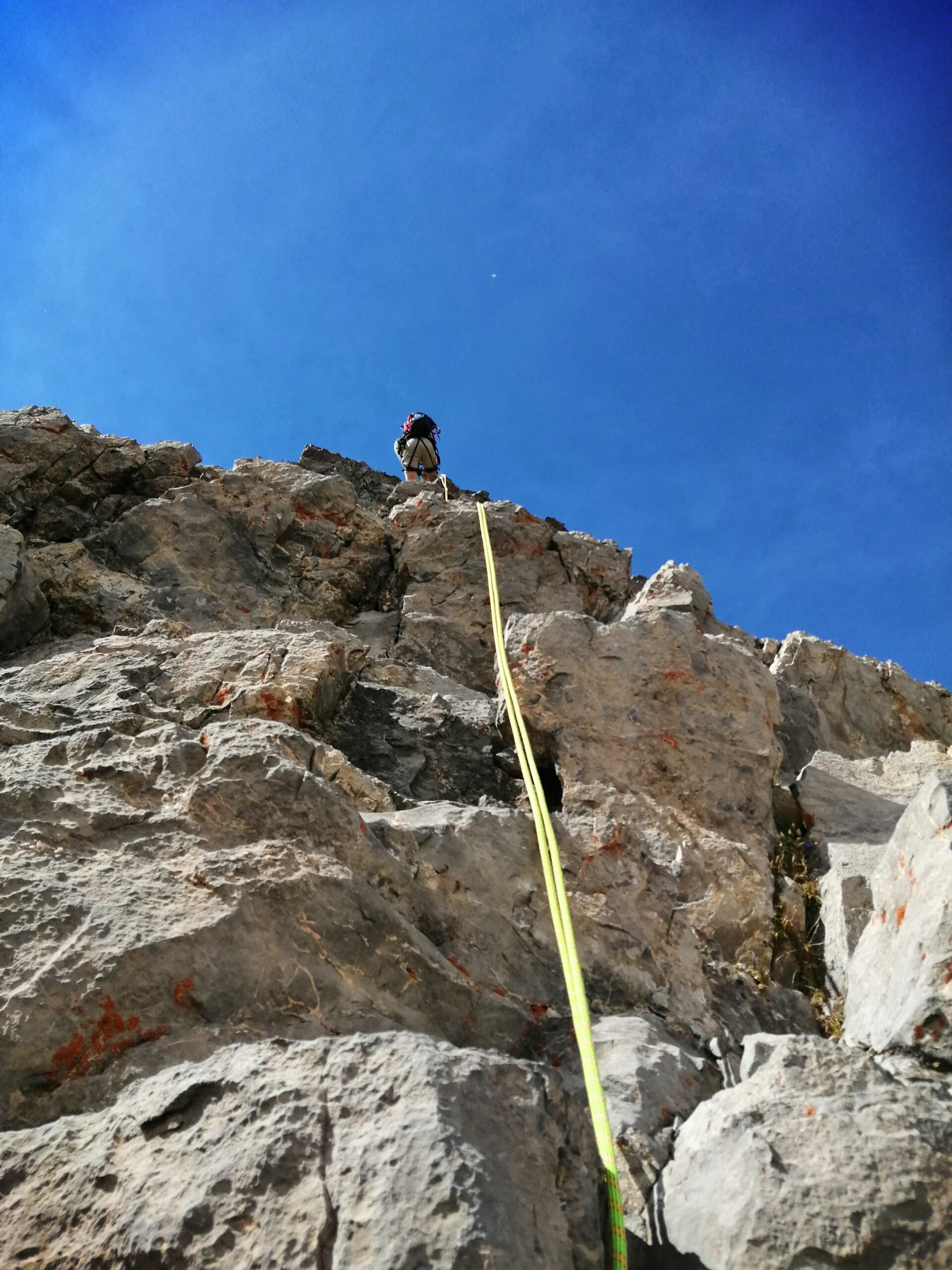 | obelix80 | Prima calata da un massone in cresta, superando il quarto spit, si arriva con un paio di metri di corda residui al terzo spit sopra il diedro. | obelix80 | Seconda calata sul diedro (parte di salita più impegnativa) fino al terrazzino dopo la corda fissa | obelix80 | Parte finale del canale da cui sale la normale | obelix80 | Parte alta sotto il Colle X. Al centro in basso lo spuntone che si aggira a destra e non a sinistra.