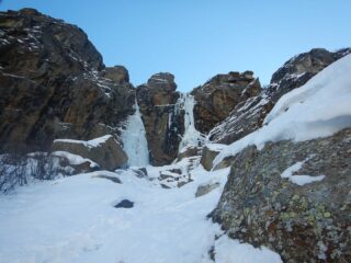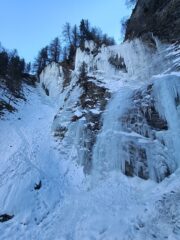 Giornata nell'anfiteatro, goulotte d'ingresso non formata nella parte alta. La classica si sale ma nel secondo risalto abbiamo trovato ghiaccio molto spaccoso. Salito anche il primo tiro…