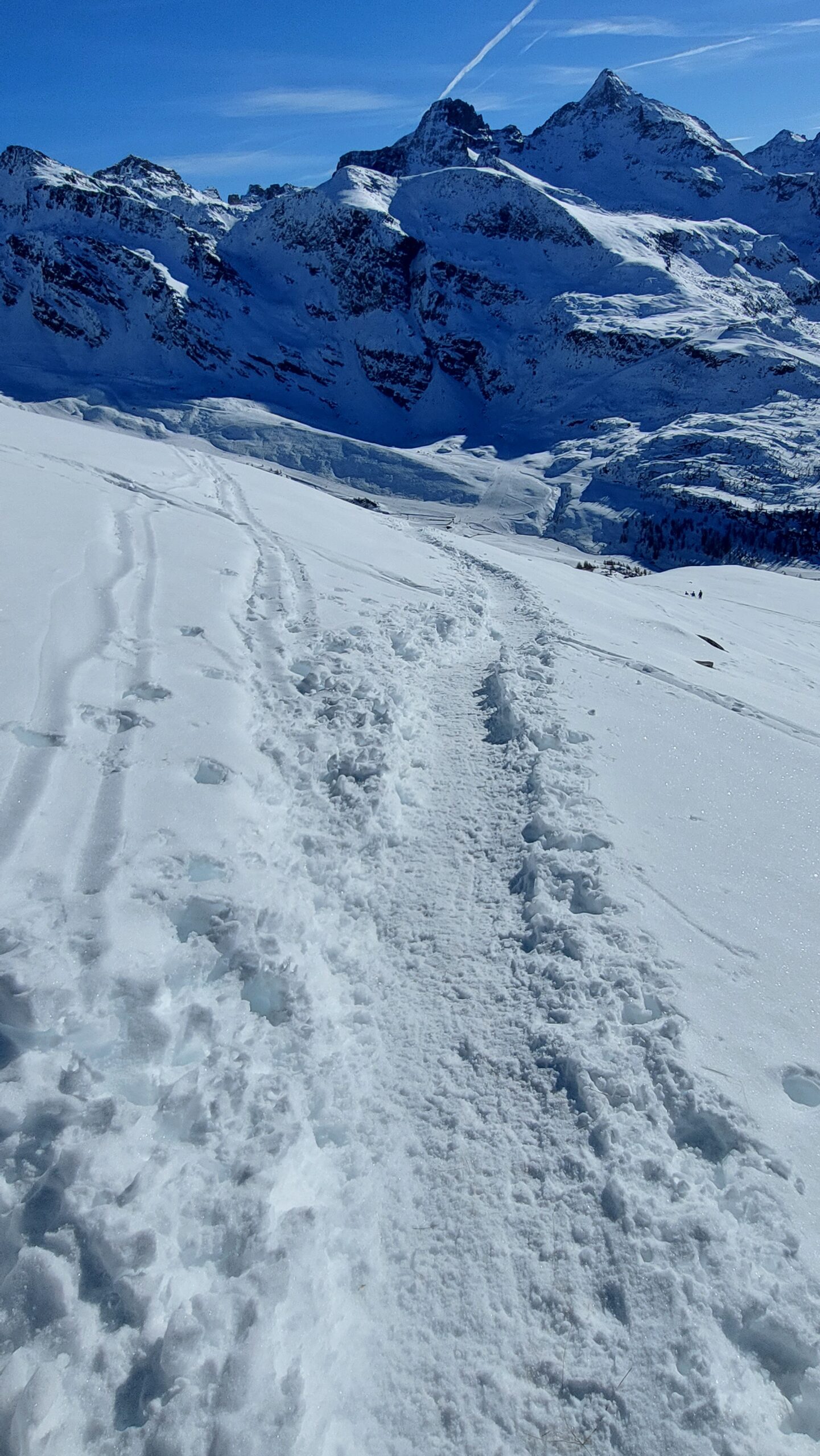 Tanta neve ma non godibile anzi faticosa per lo zero termico oggi già a 3500 mt. Partiti alle 6,40. Neve continua da 2100 metri ma…