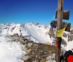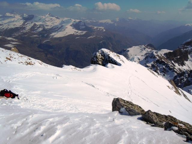 | otzi | Base del canale all'alba | otzi | Parte bassa | otzi | Sopra la strettoia | otzi | Panorama sulla Meja | otzi | Colletto a 2620 | otzi | Piramide di vetta | otzi | Croce di vetta