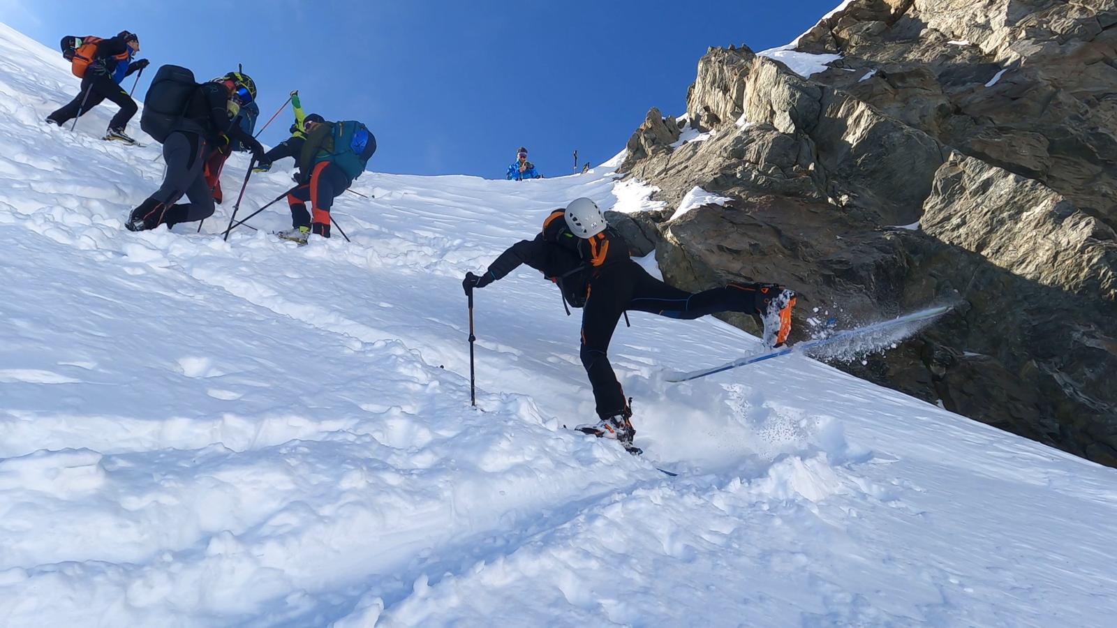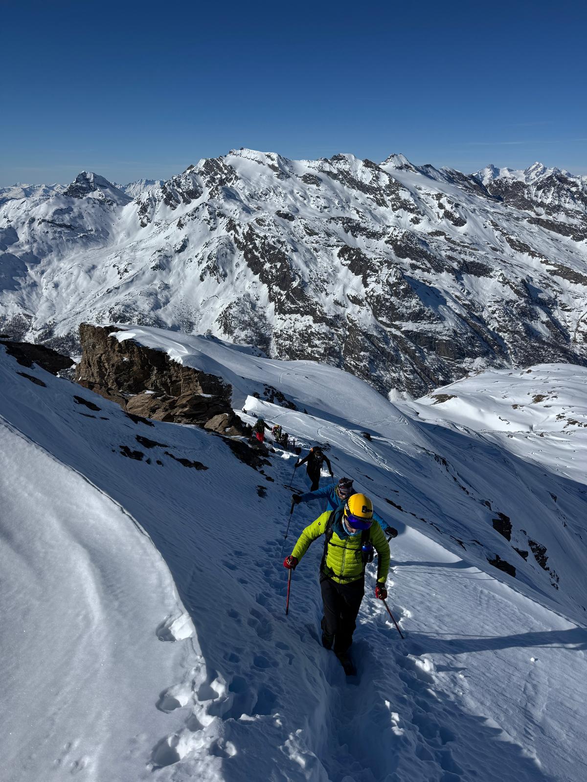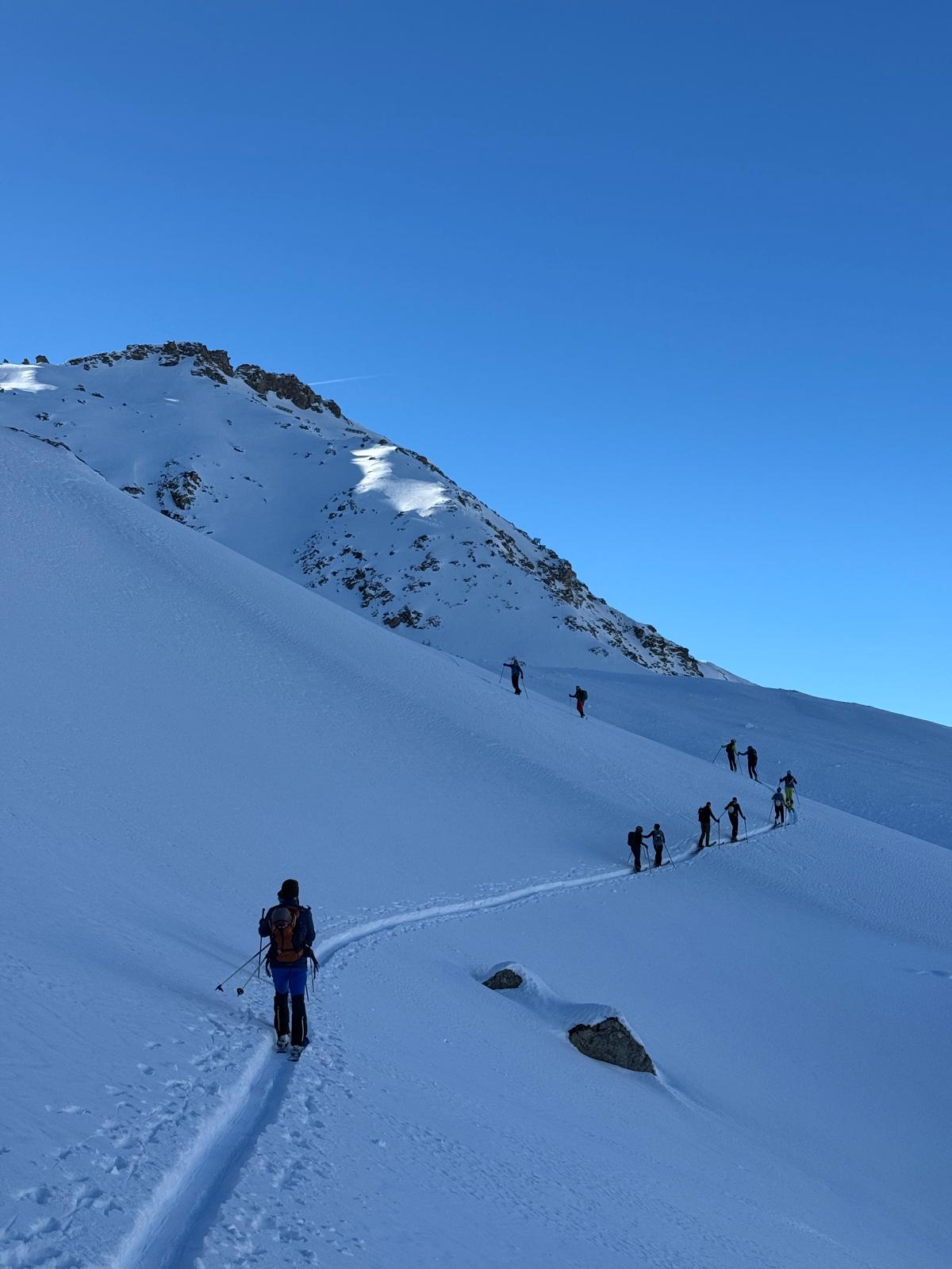 Gita di gruppo del corso intermedio della Valléé, graziato da condizioni perfette. Nevicata notturna di 20/30 cm, sole, freddo e assenza di vento. Tutta da tracciare, altre…