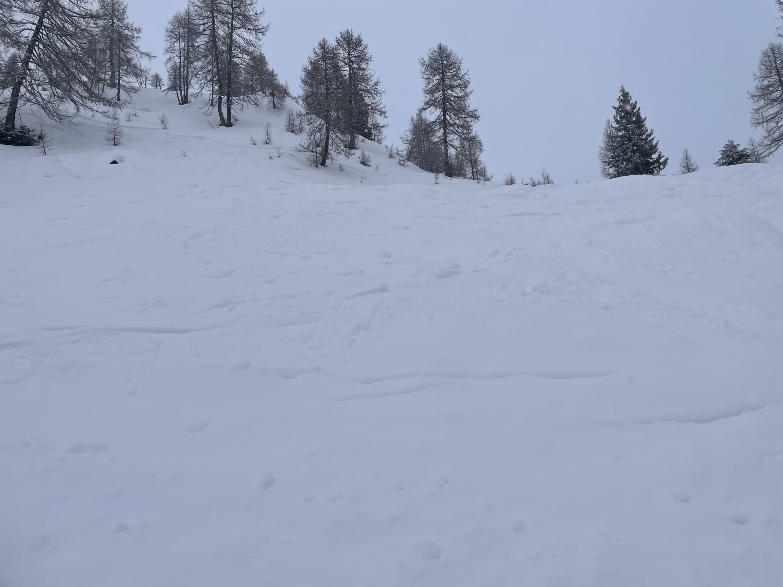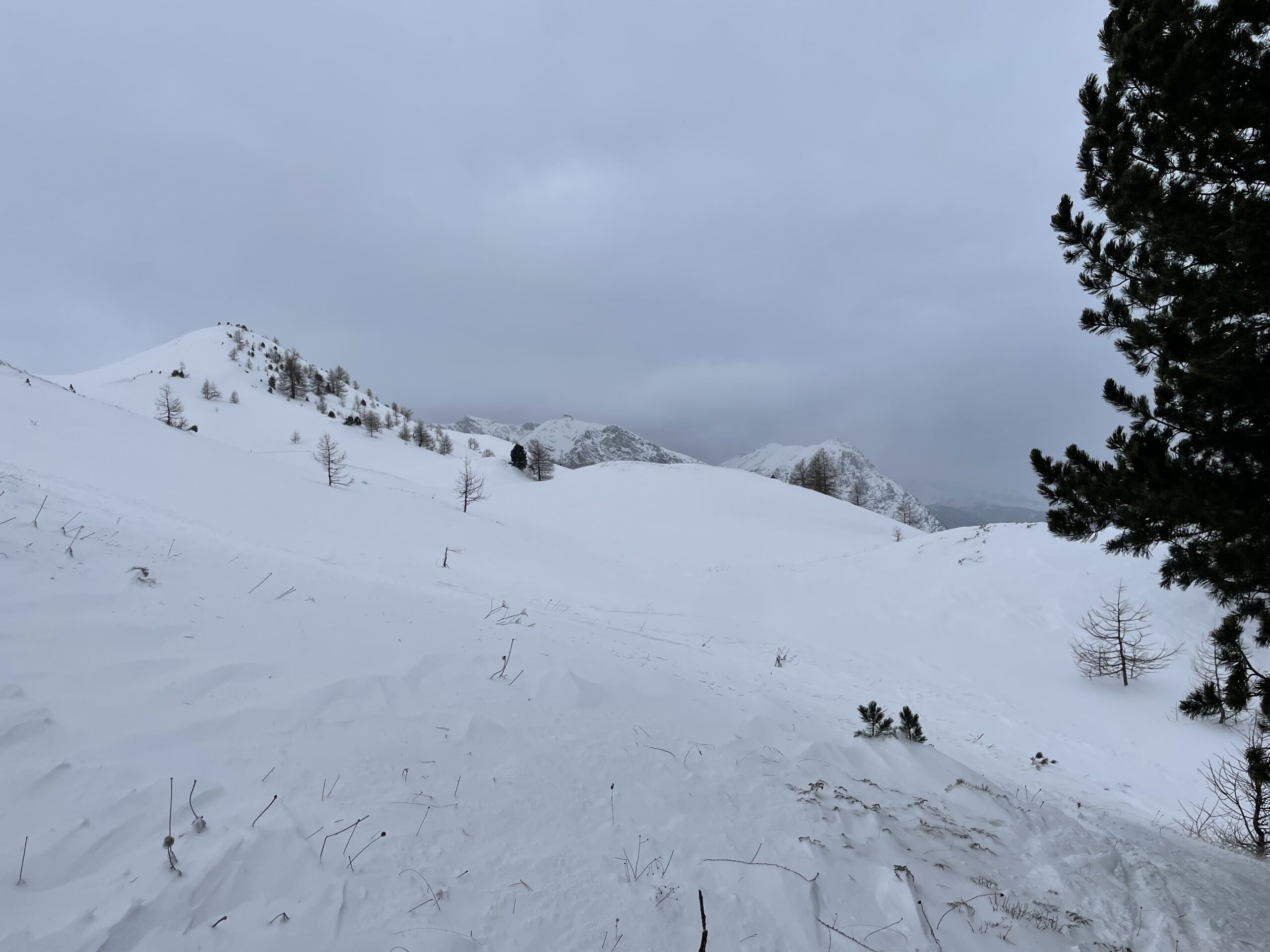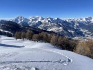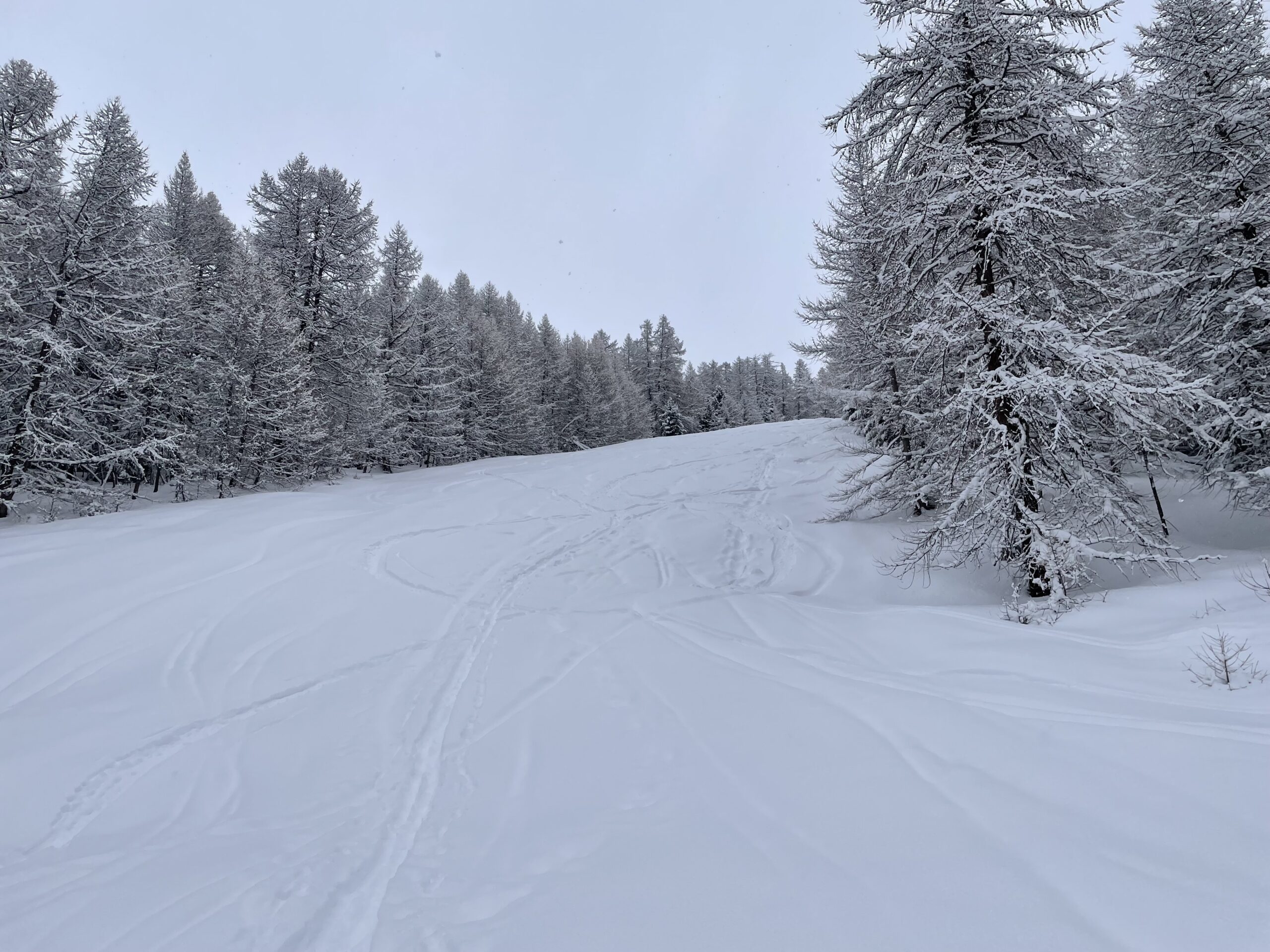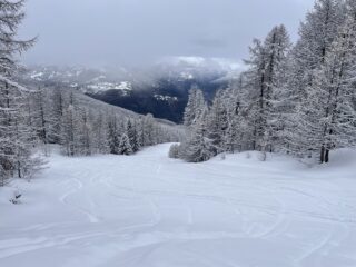 Ancora parecchia neve, partendo da Fenile, fuori pista un po’ di polvere pressata solo dal colle sopra gli impianti fino alle piste.