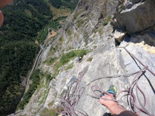 Il primo tiro è 5c, la roccia è calcare molto bello, tranne una fascia di scisto nel quinto tiro che però è molto bella e…