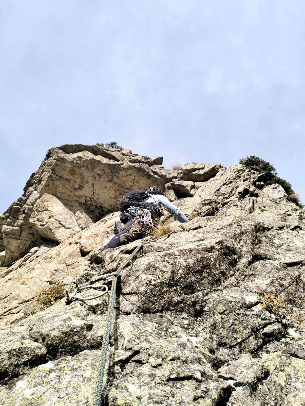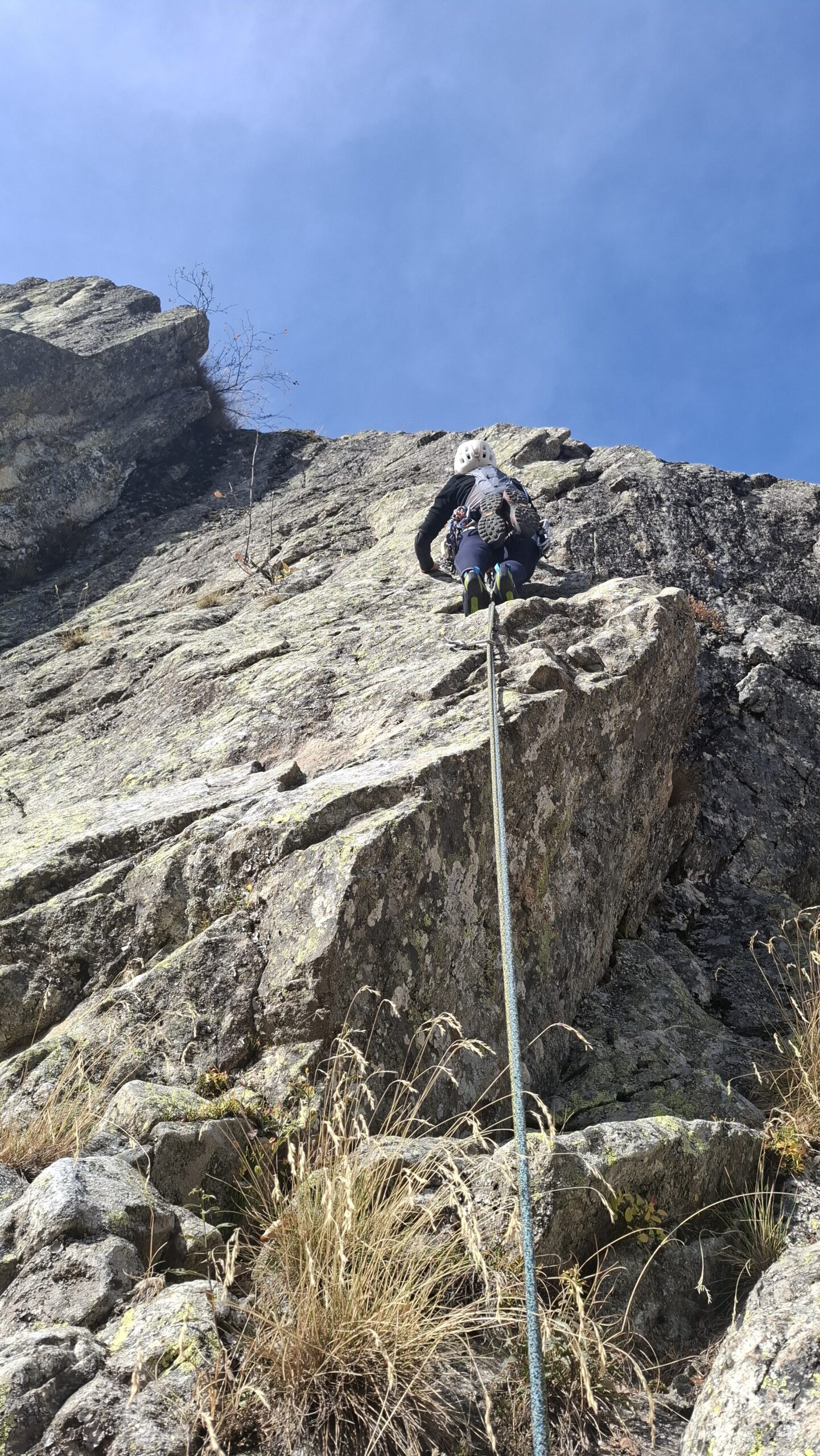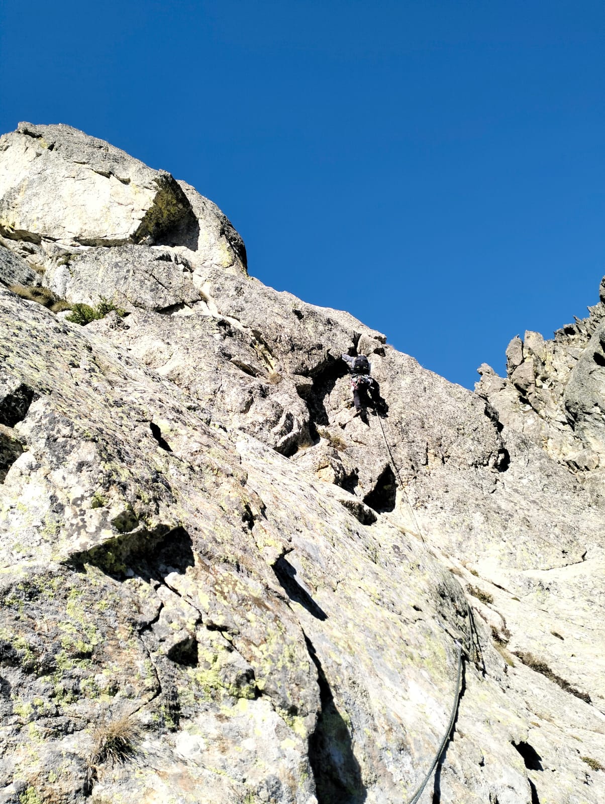 È visibile il cordone che indica l'attacco della lunghezza dopo il trasferimento di 60m | patrdalm | La lunga placca di L6, 55m di 5b