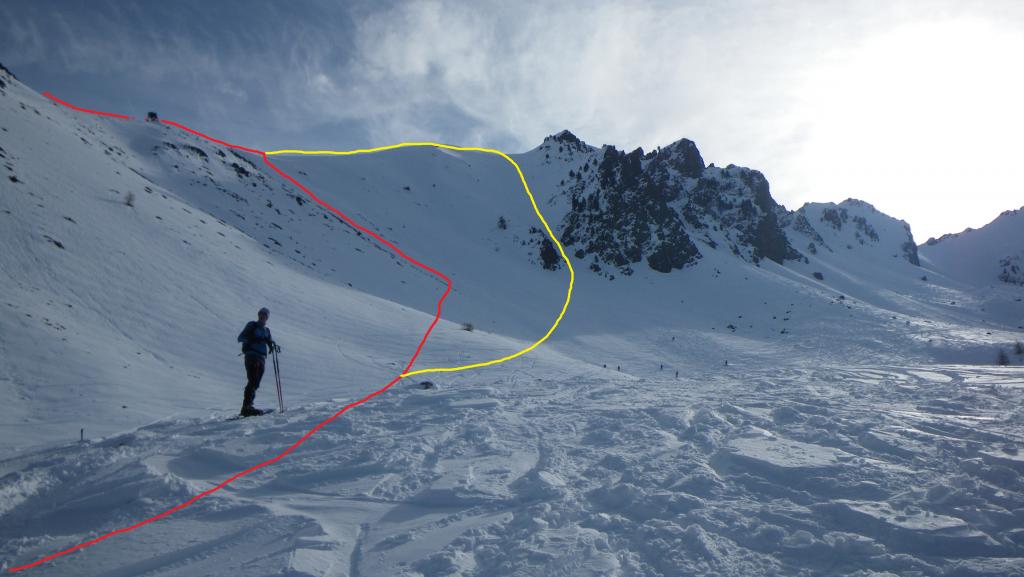 | pedrito | Il pendio arato prima del bivio (foto Roby) | pedrito | al bivio in fondo lo Gimont a sx in rosso la traccia normale (BR) in giallo la variante ripida di discesa (OR) | pedrito | al Colle Guignard su farinella.. | pedrito | dalla Vetta verso il colle