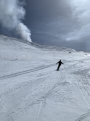 Salita dal versante sud, neve non abbondante ma continua. Crosta da vento e sastrugi (evitabili) in alto. Nebbia fitta dai 2000 in su. Scesi sulle…