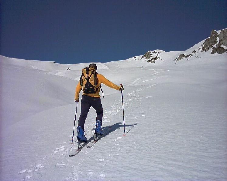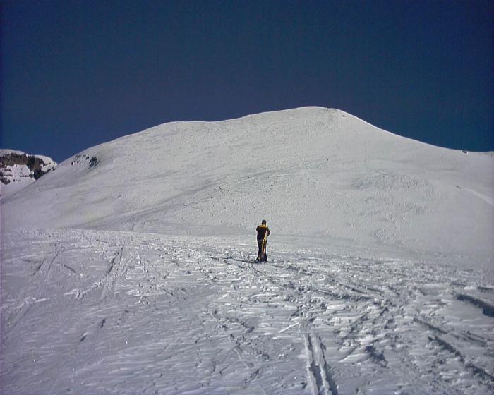 Che dire: giornata tiepida e limpida, senza vento, neve farina da favola; solo in brevi tratti crostosa. Saliti per la cresta N-O e scesi nel canale…