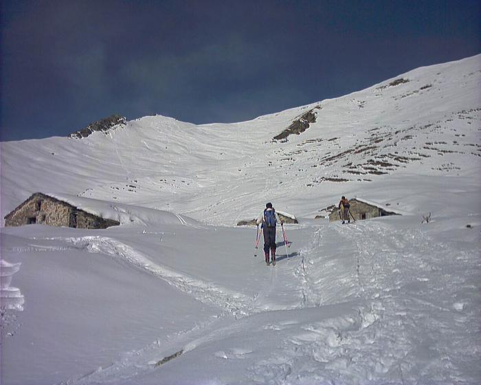 Nella parte bassa la neve è poca: tenersi sulla stradina con la quale è possibile scendere fin quasi a Morinesio. Dai 2000 in su bella neve…