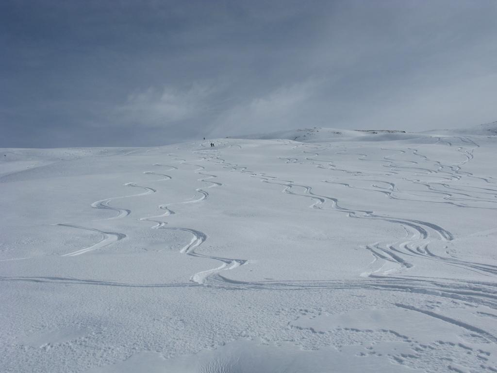 La miglior neve dell'anno, in discesa leggera e asciutta, un galleggiante naturale; qualche breve tratto di krusta nei pressi dell'arrivo. 900 m in 1h e 56.