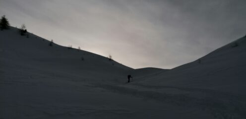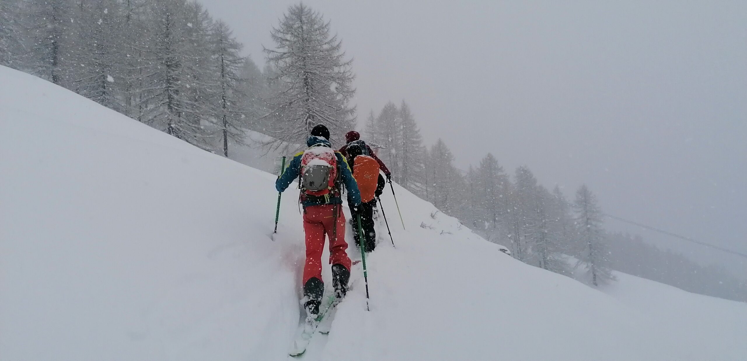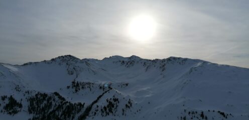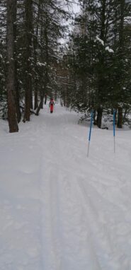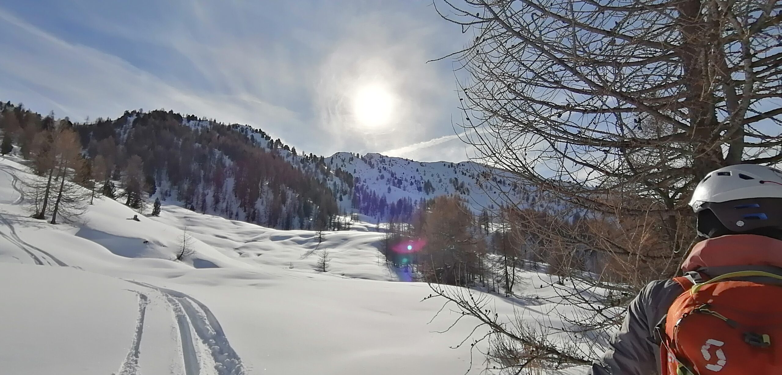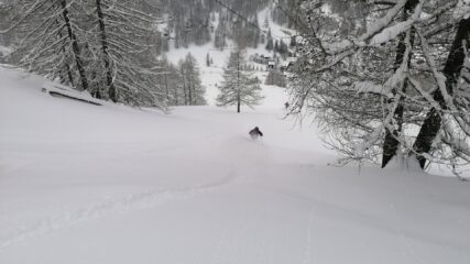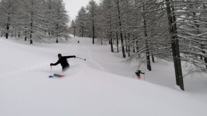 Oggi le condizioni della Fournier hanno richiesto una ripellata, ottima farina fino al lago. Secondo giro scesi dal Begino, un pelo più lenta sui pendii…