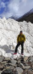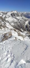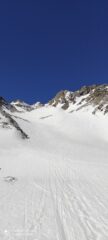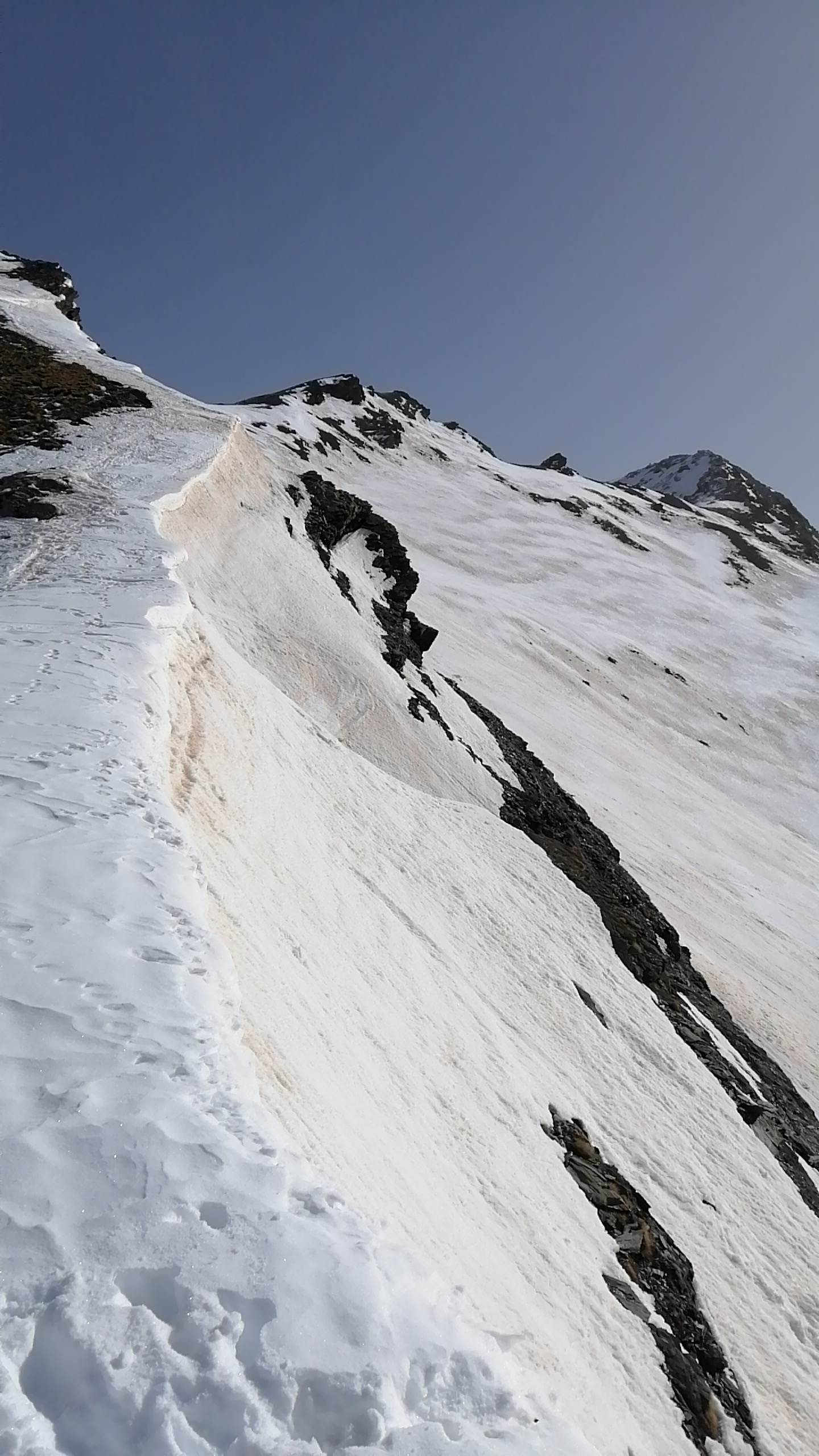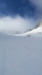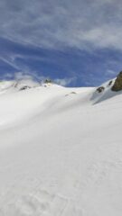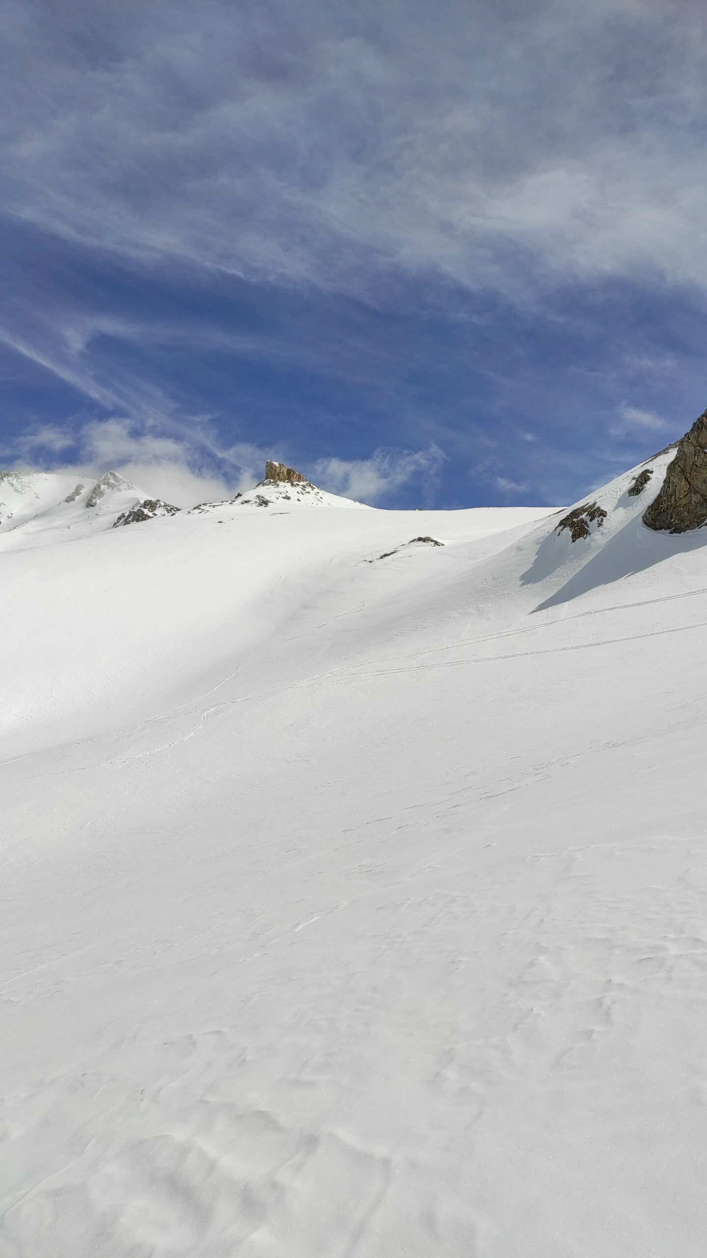 Portage fino quasi al Biv. Tornior poi neve continua prima crostosa portante fino all'uscita del canalino. Alcune grosse cornici sovrastano il pendio che con queste…