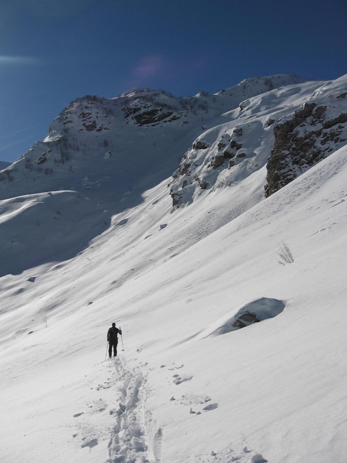 Partenza sci dall'auto. Copertura neve continua. Neve farinosa umida a tratti pesante. Ottima sciabilità. E poi partenza e arrivo sci ai piedi. Nel vallone ci…