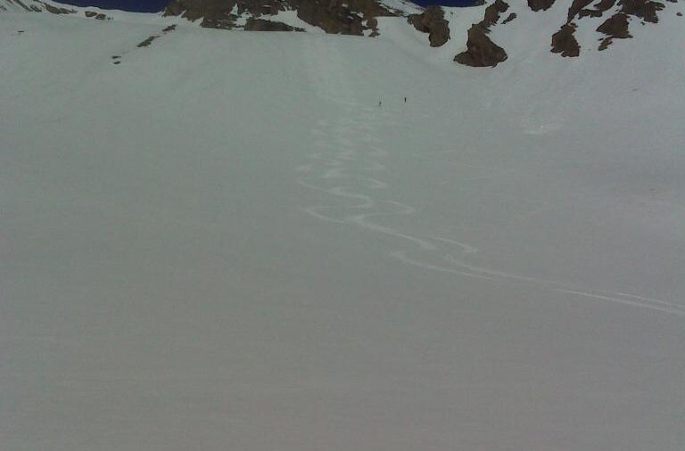 Il pendio ripido di accesso alla Comba di Toula è privo di neve. Si portano gli sci per 20 minuti in salita. Poi ottime condizioni.…