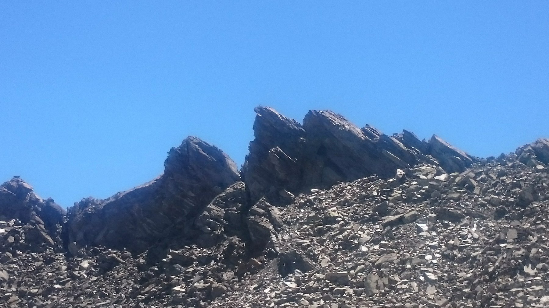 | rebatta-bousa | Becca di Tzaboc, si sale sulla sinistra della cresta. | rebatta-bousa | Antecima, divisa dalla cima da stretto intaglio. | rebatta-bousa | Vetta | rebatta-bousa | Intaglio che separa la vetta dall'antecima.