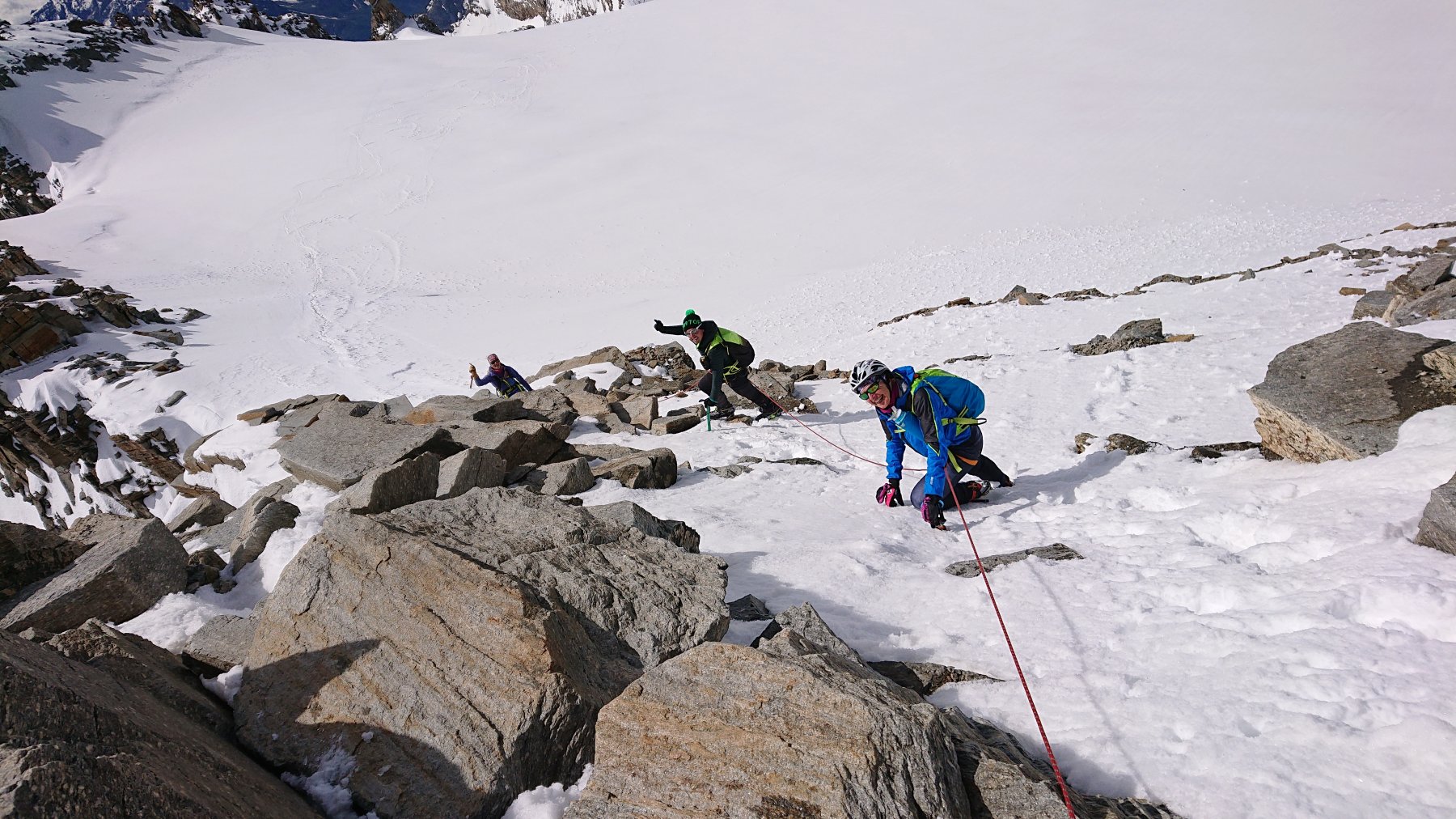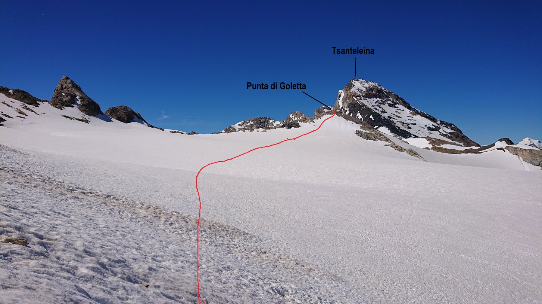 | rebatta-bousa | Il percorso per la punta est | rebatta-bousa | Il percorso per la punta centrale | rebatta-bousa | La punta est | rebatta-bousa | Sulla punta centrale | rebatta-bousa | La centrale dalla punta ovest | rebatta-bousa | La luna ci indica la nostra meta. | rebatta-bousa | Mare di nuvole su Aosta | rebatta-bousa | La cresta NE, e stambecchi al pascolo. | rebatta-bousa | Fine nevaio e inizio tratto ripido con la sosta nel camino. | rebatta-bousa | Il camino | rebatta-bousa | Sulla vetta nord | rebatta-bousa | Discesa sulla normale, non bella. | rebatta-bousa | Verso la punta di Goletta | rebatta-bousa | Sotto il colle di Tzanteleina | rebatta-bousa | Ghiacciaio di Tsanteleina