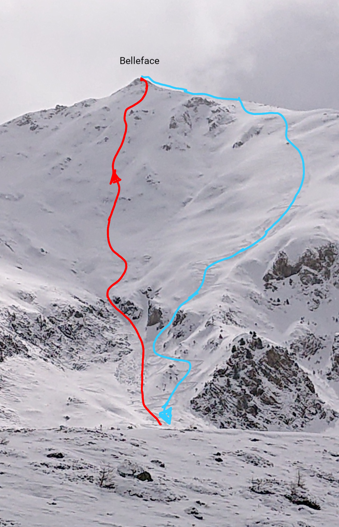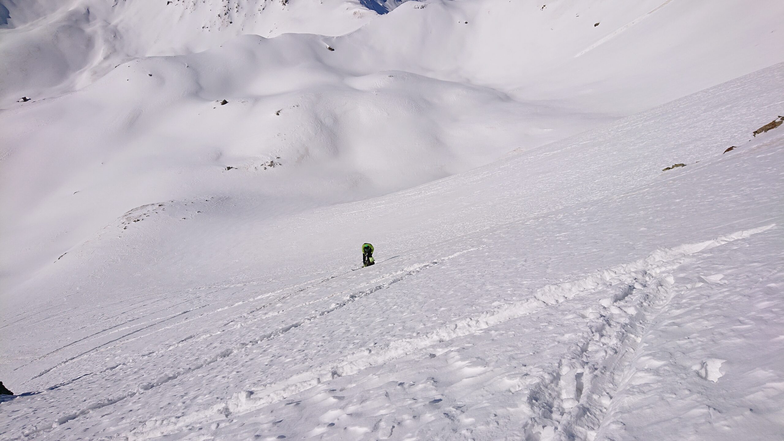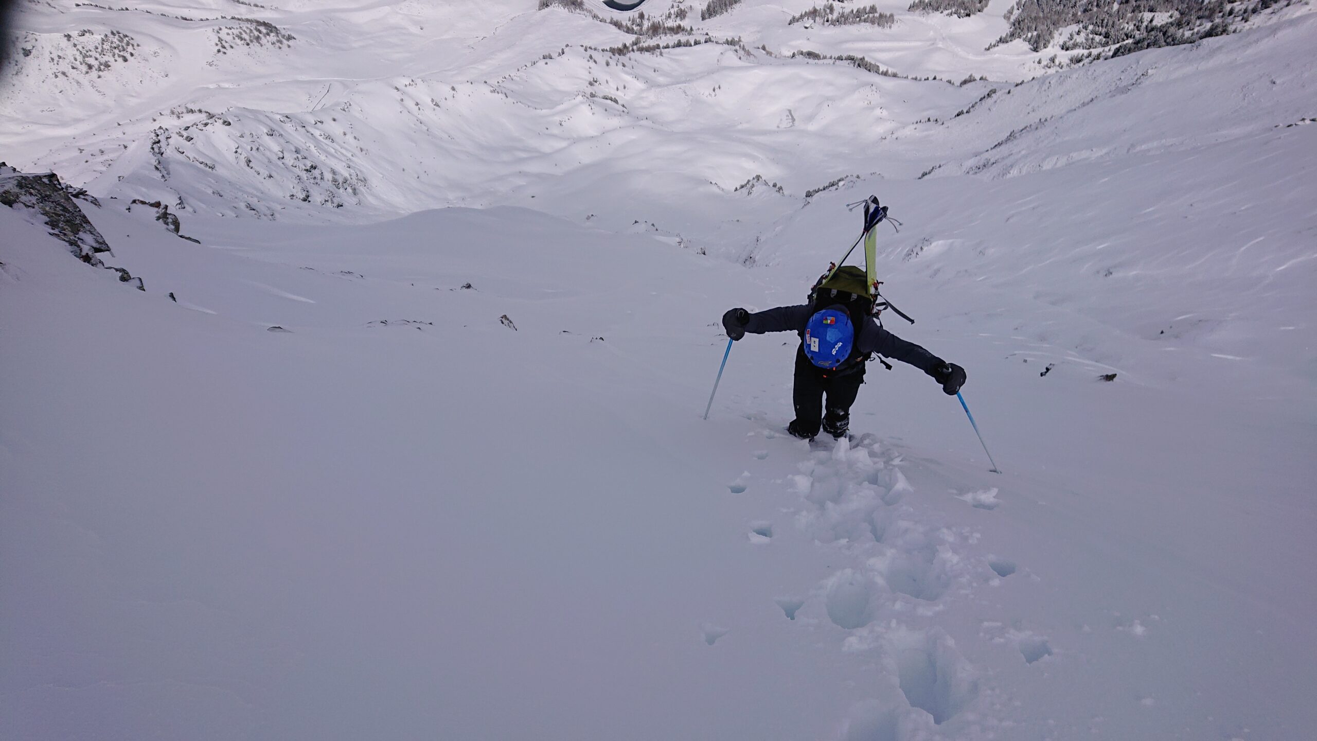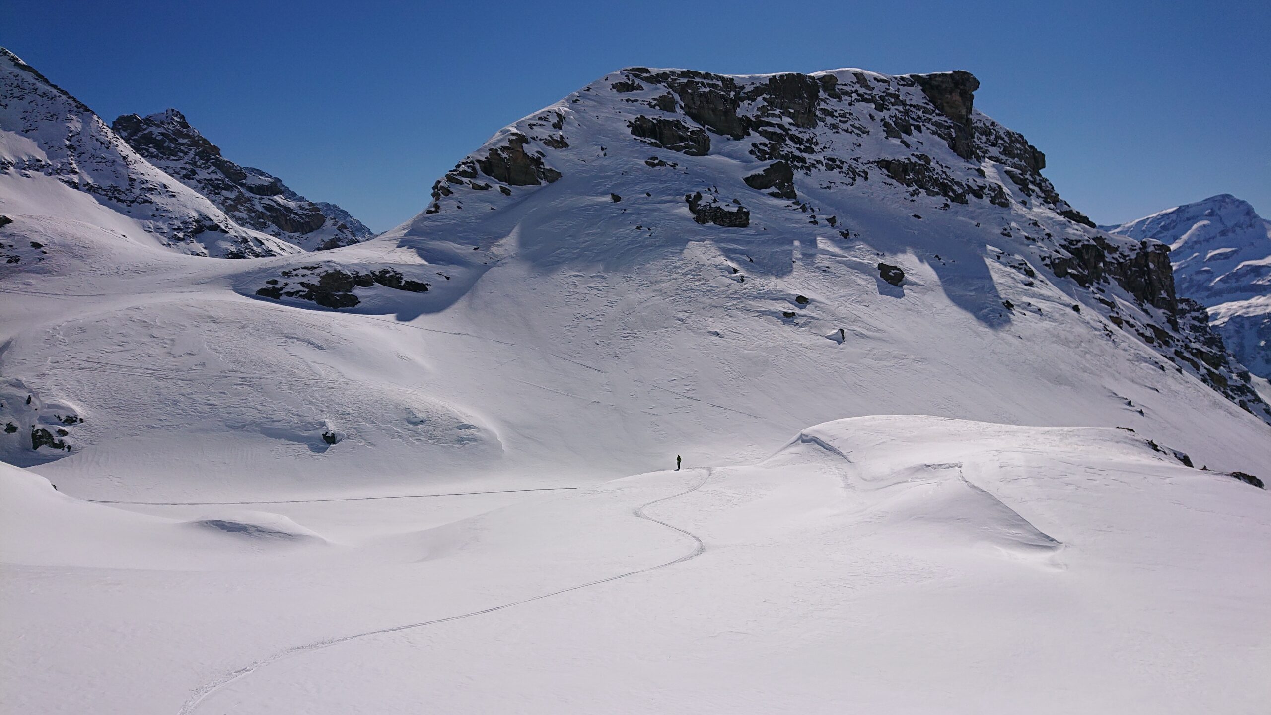 Blu=discesa | rebatta-bousa | Il canale risalito per raggiungere il colletto in cresta | rebatta-bousa | Il colletto e dietro la Entremont Est | rebatta-bousa | Il pendio est che porta in vetta, carico e poco stabile. Abbiamo seguito la traccia del camoscio. | rebatta-bousa | Sulla dorsale | rebatta-bousa | Delia in vetta | rebatta-bousa | I canali sud della Belle Combe e Petit Golliaz | rebatta-bousa | Andando verso la vetta più alta | rebatta-bousa | Io in vetta | rebatta-bousa | Il vallone da scendere | rebatta-bousa | La vetta dal parcheggio