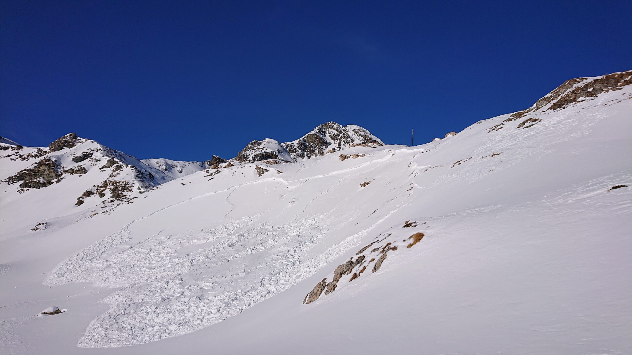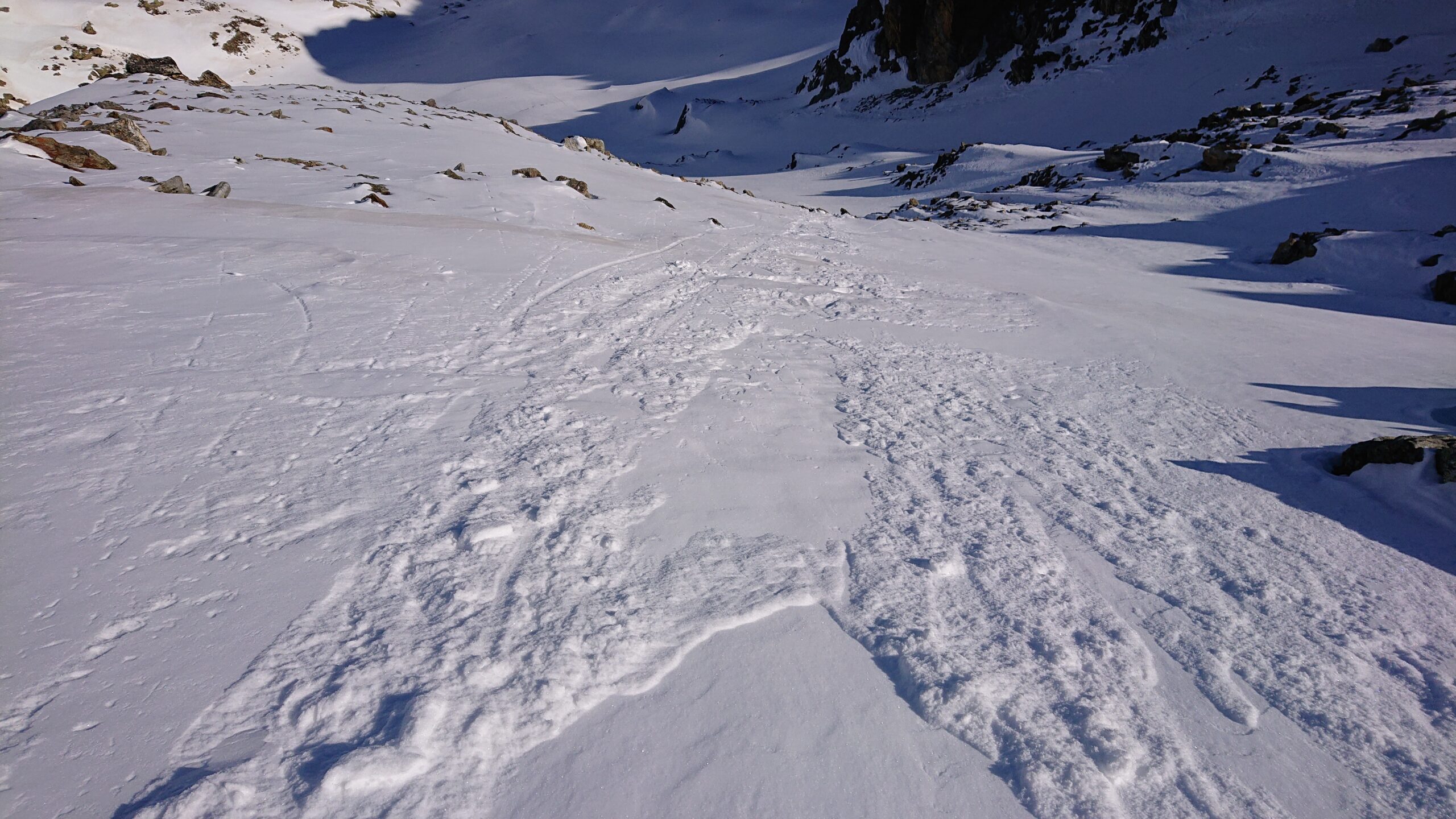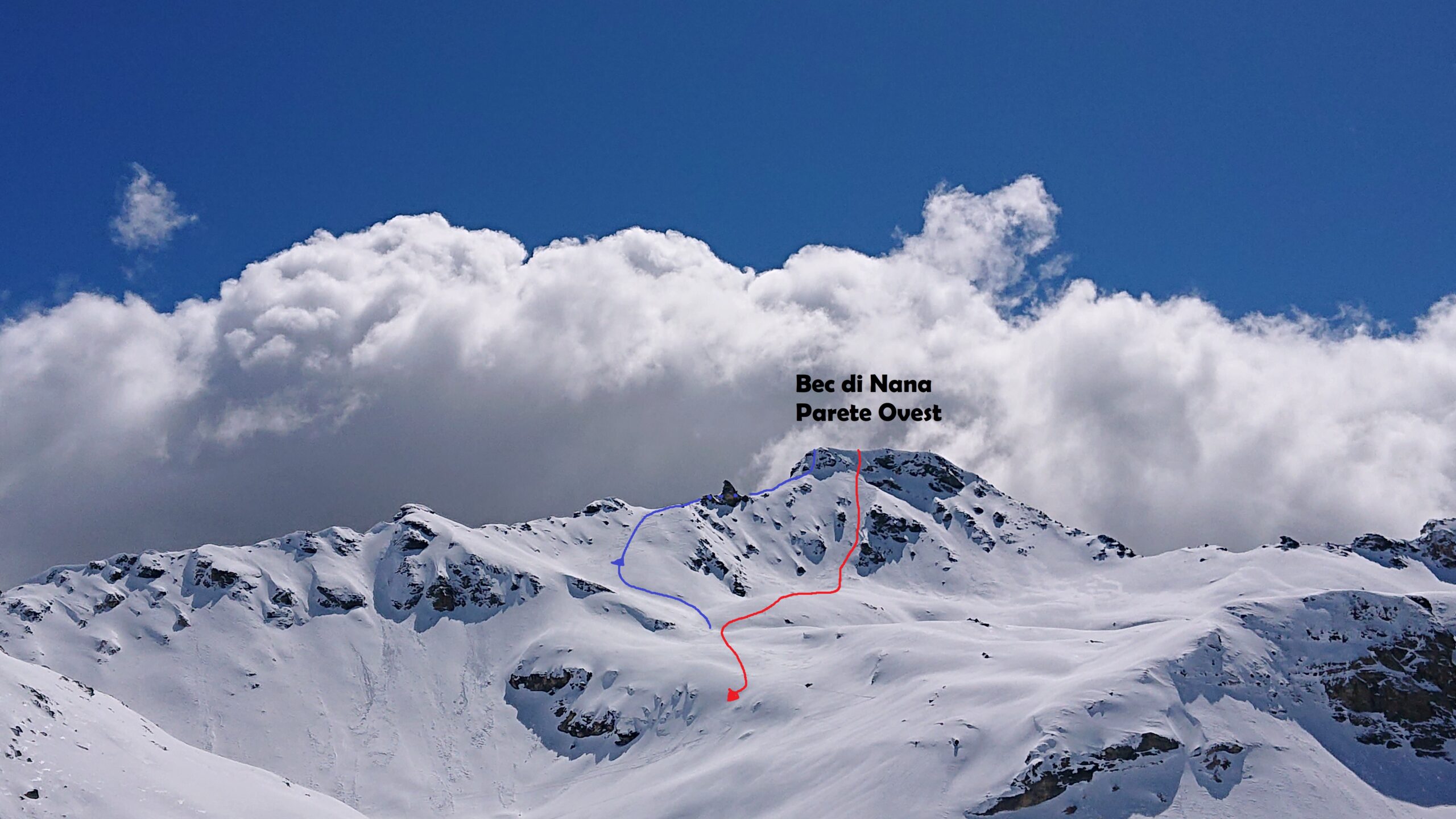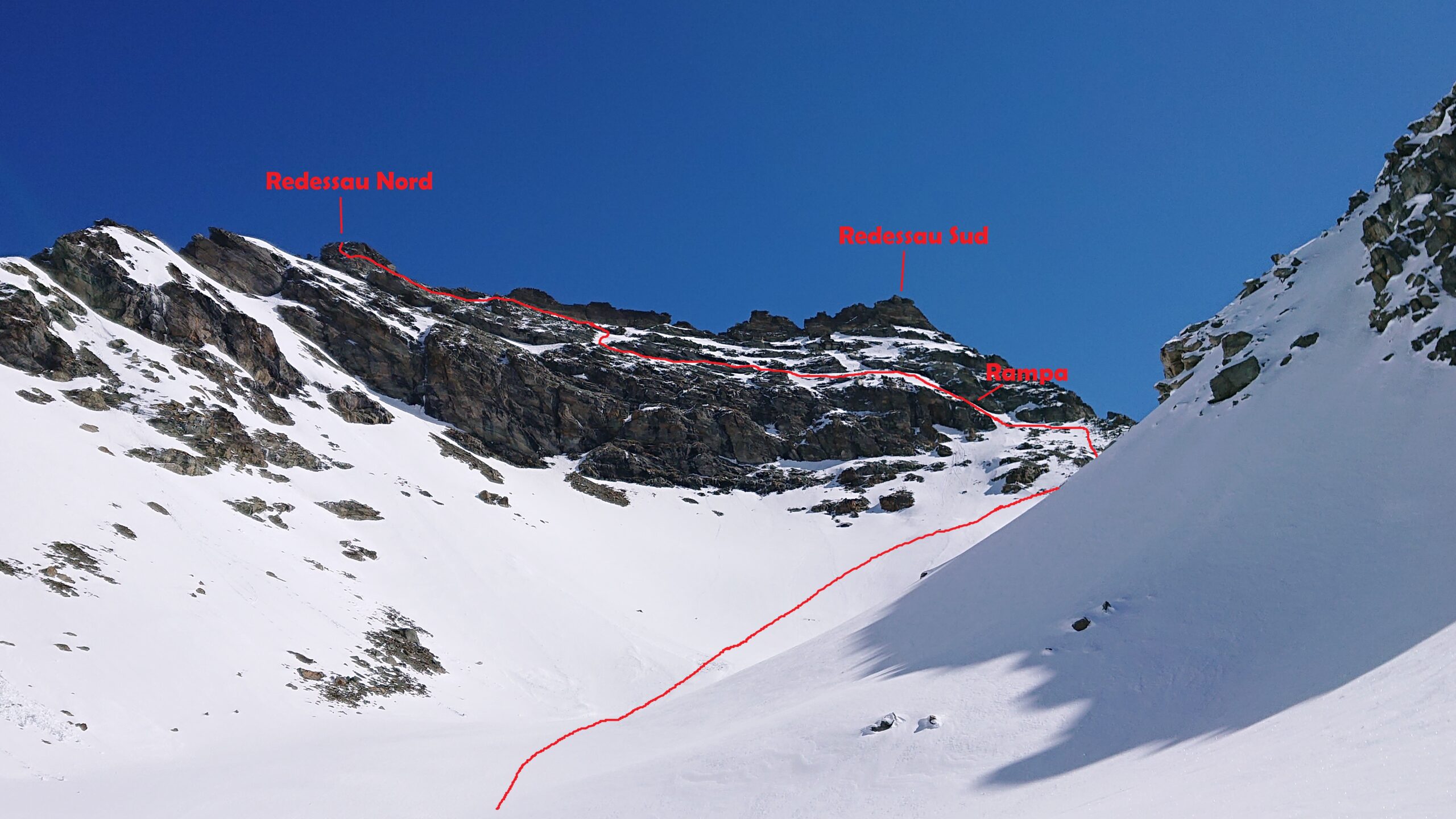 Blu=discesa | rebatta-bousa | Il canale risalito per raggiungere il colletto in cresta | rebatta-bousa | Il colletto e dietro la Entremont Est | rebatta-bousa | Il pendio est che porta in vetta, carico e poco stabile. Abbiamo seguito la traccia del camoscio.