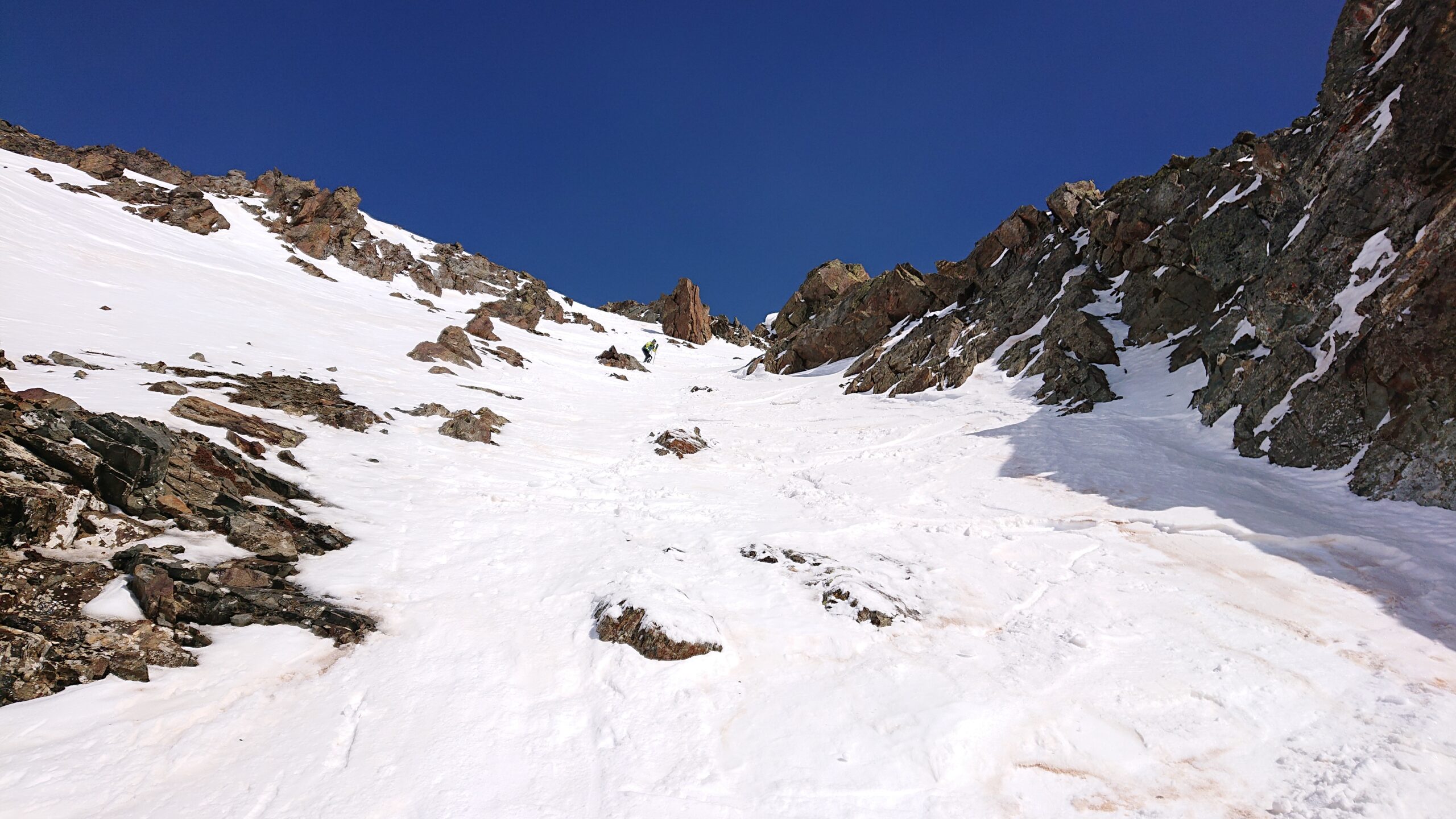 | rebatta-bousa | Sui pendii mediani | rebatta-bousa | Il canale sceso, e i 5 francesi davanti noi | rebatta-bousa | Abbiamo passato i francesi, che ringrazio. | rebatta-bousa | In vetta | rebatta-bousa | Breve discesa sulla cresta SE per reperire il canale | rebatta-bousa | Il bel canale. | rebatta-bousa | Delia addomestica il canale senza problemi. | rebatta-bousa | La parte più stretta | rebatta-bousa | Uscita canale