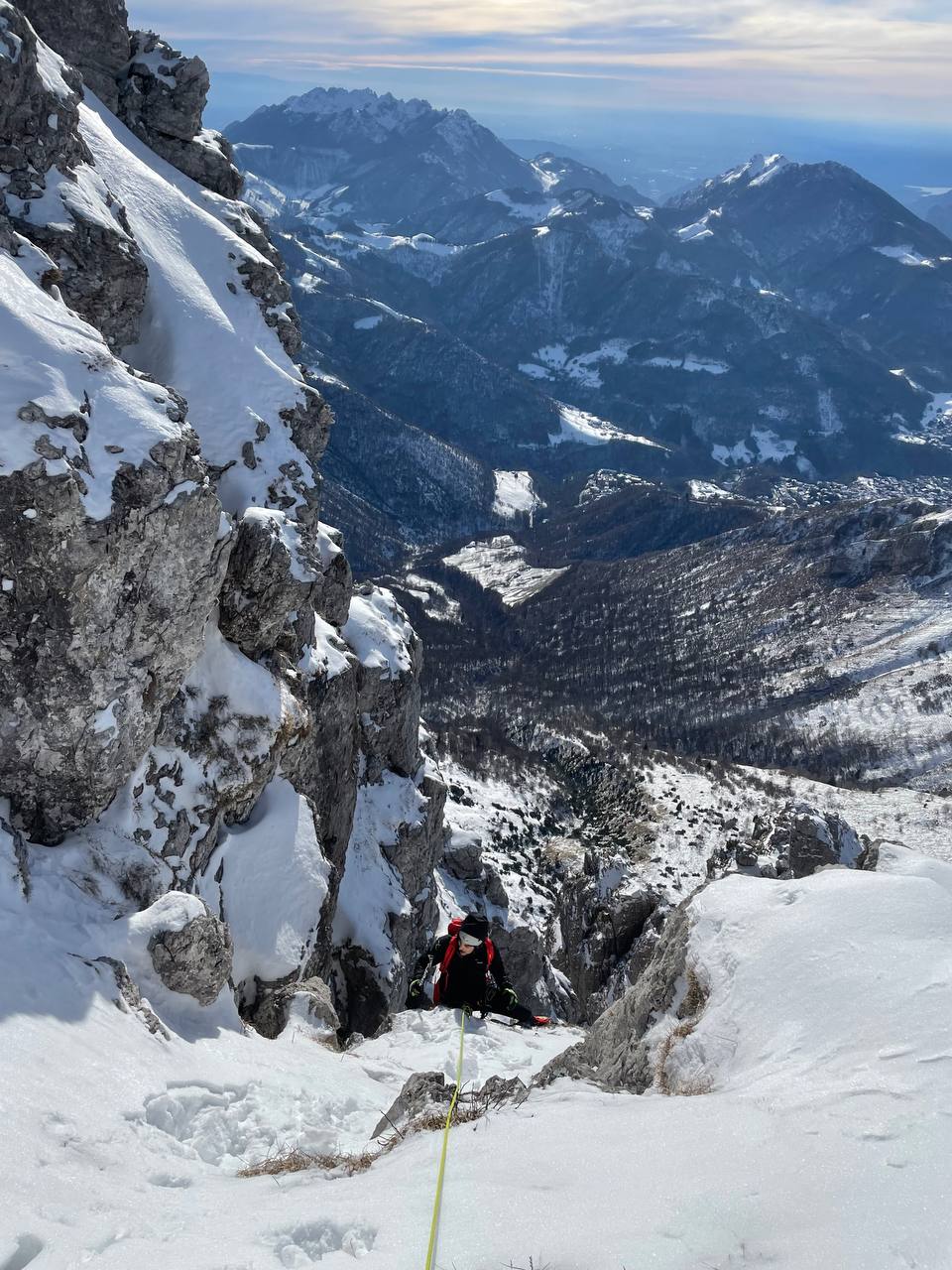 | ribb | Il magnifico calcare del corno piccolo dalla cima | ribb | Avvicinamento breve, soleggiato e panoramico | ribb | Piccoli risalti e caminetti costellano questa divertente via