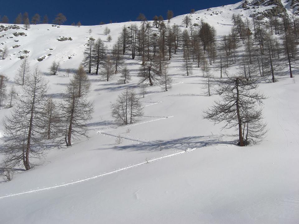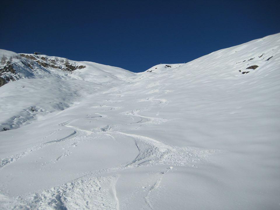 | roby4061 | in salita. a dx dell'isolotto roccioso la traccia delicata di salita, meglio passare a sx | roby4061 | discesa pendii parte alta, mezzo metro di polvere | roby4061 | verso metà vallone entrelor | roby4061 | no words | roby4061 | discesa verso le baite | roby4061 | vallone dalla croce