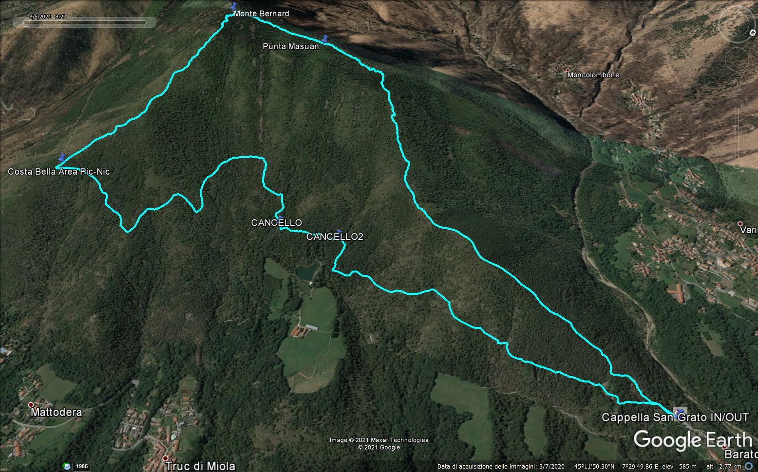| roby58 | sullo sfondo l'alpe Bruno Piacentin al pian della Sella | roby58 | la borgata di Cervelluzzi | roby58 | pilone votivo al Pian della Sella | roby58 | traccia gps in google earth