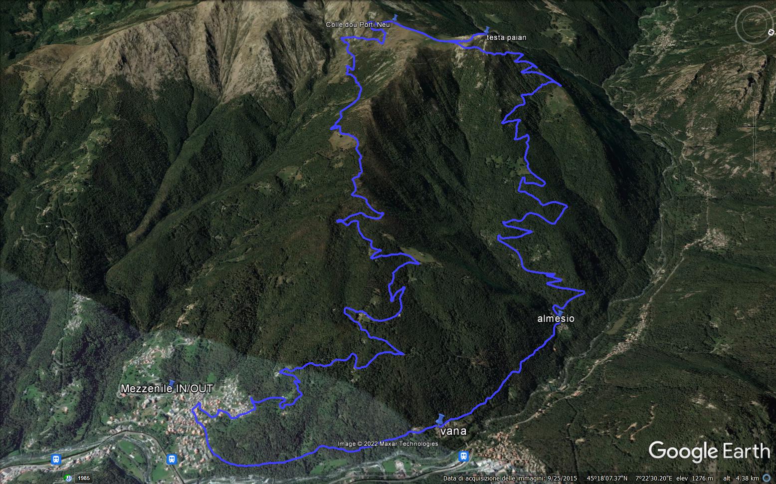 | roby58 | tratto un po' innevato dopo il Colle dou Porti Neu...ma si passa bene. | roby58 | laggiù Testa Paian | roby58 | in vetta a Testa Paian | roby58 | la variante in single trak a monte di Almesio e che conduce a Vana e a Mezzenile senza quasi perdere quota. Bella alternativa all'asfalto di Ceres su sp1 | roby58 | si entra nelle bella borgata Vana di Ceres | roby58 | tratto da attenzione in prossimità del canale di presa | roby58 | single trak sotto condotta. | roby58 | ingresso in Mezzenile da single track | roby58 | traccia gps in google earth