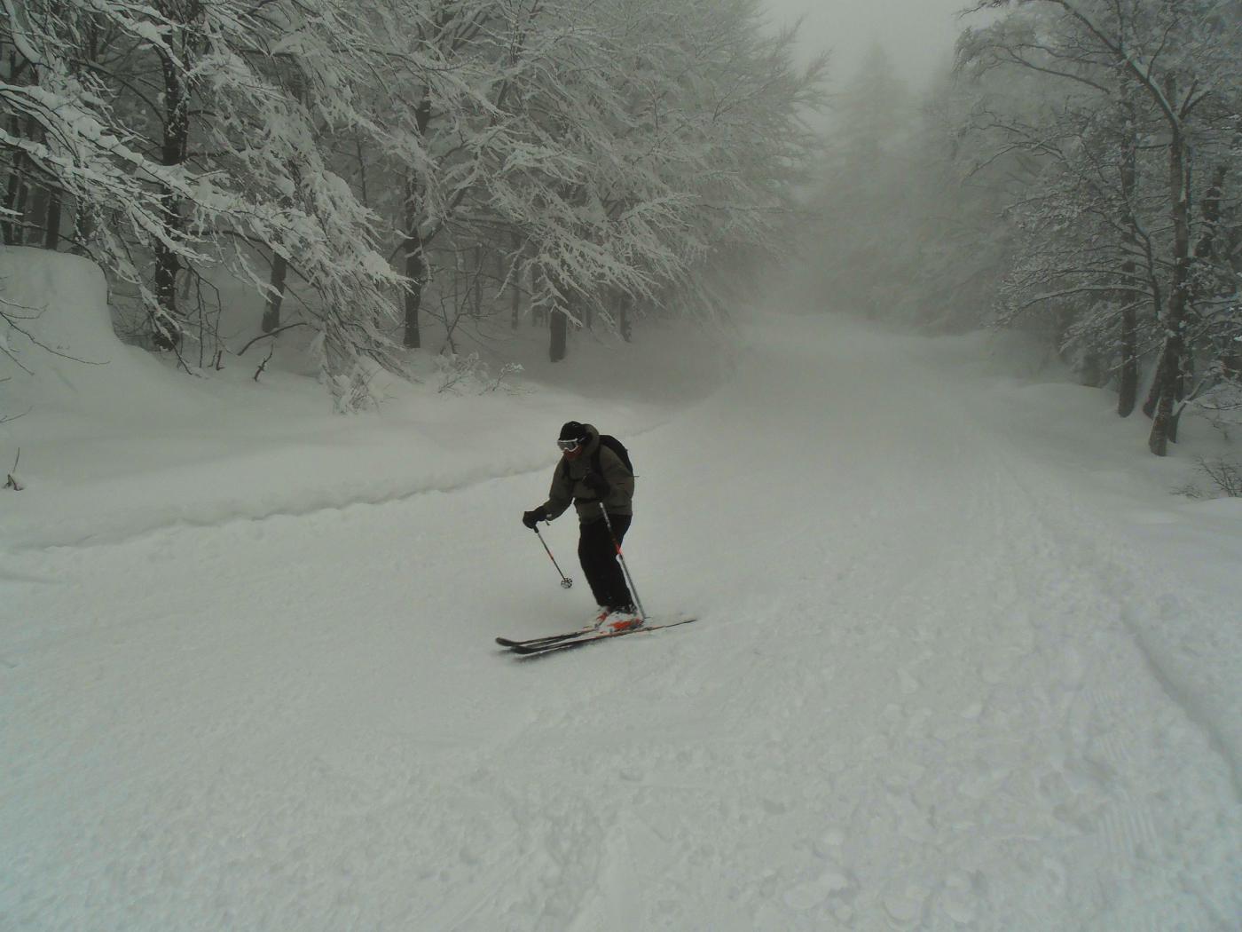 Oggi gita fatta più che altro per seguire la gara del periplo, fitta nevicata per tutta la mattinata, discesa su neve fresca ma scarsa…