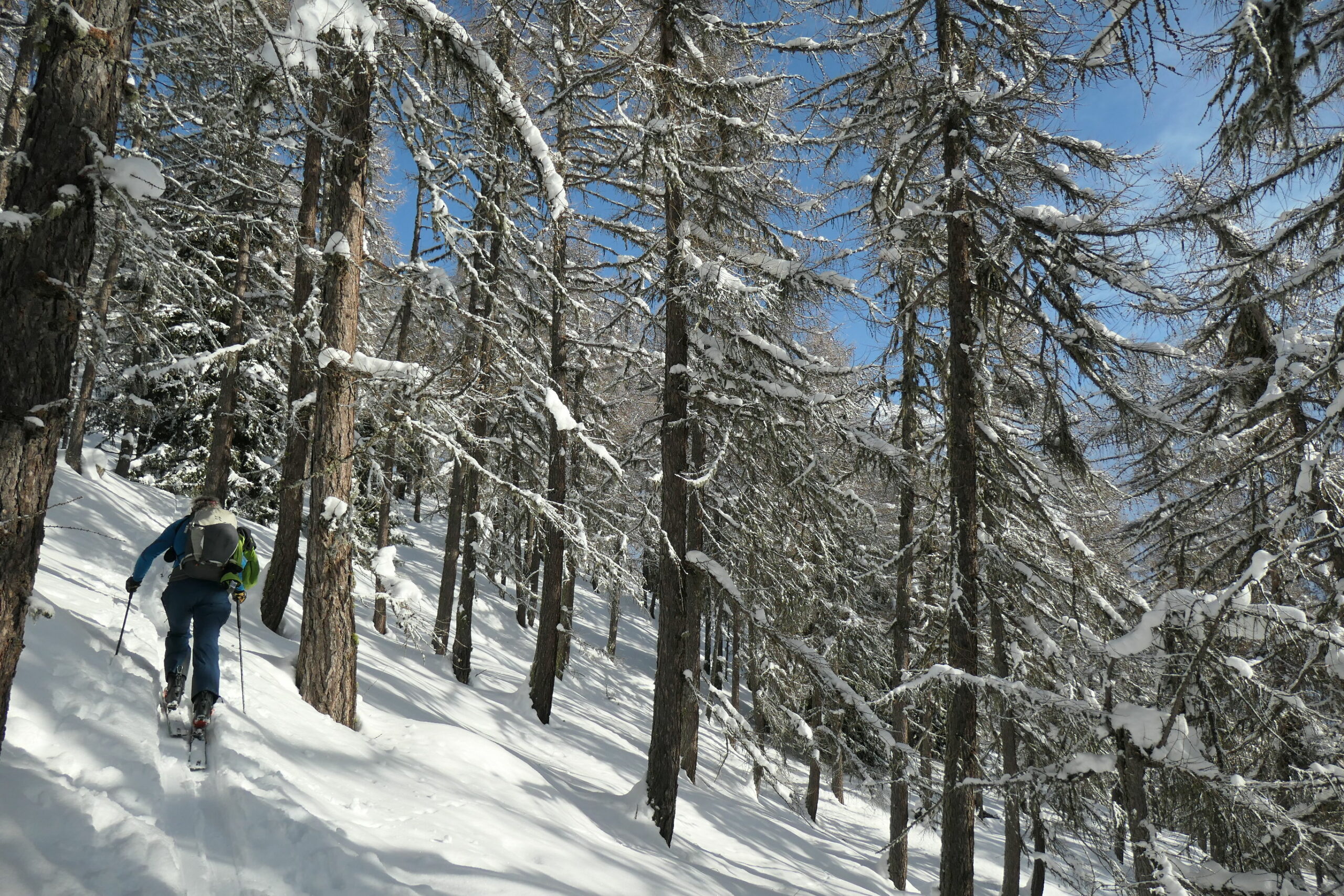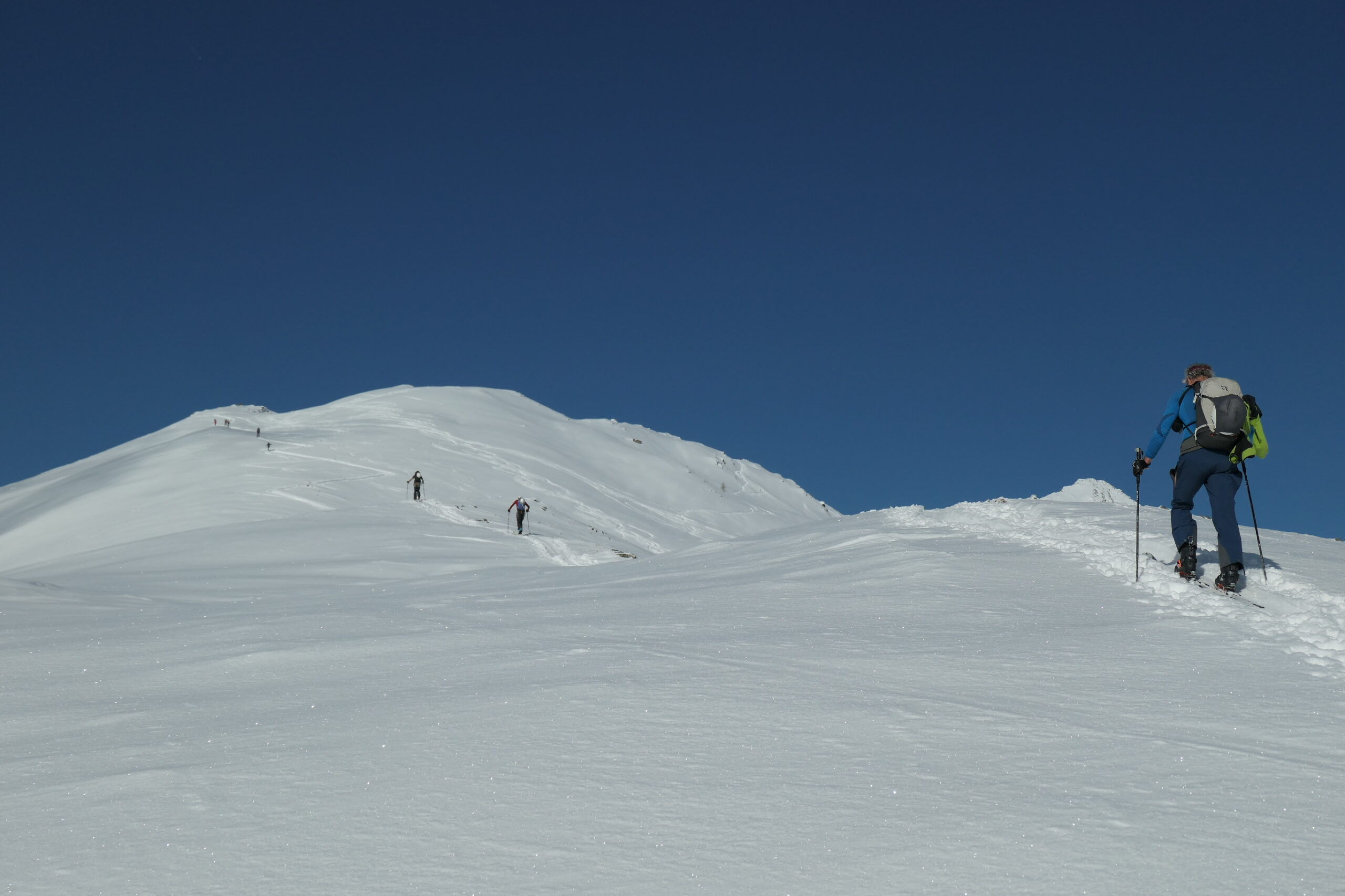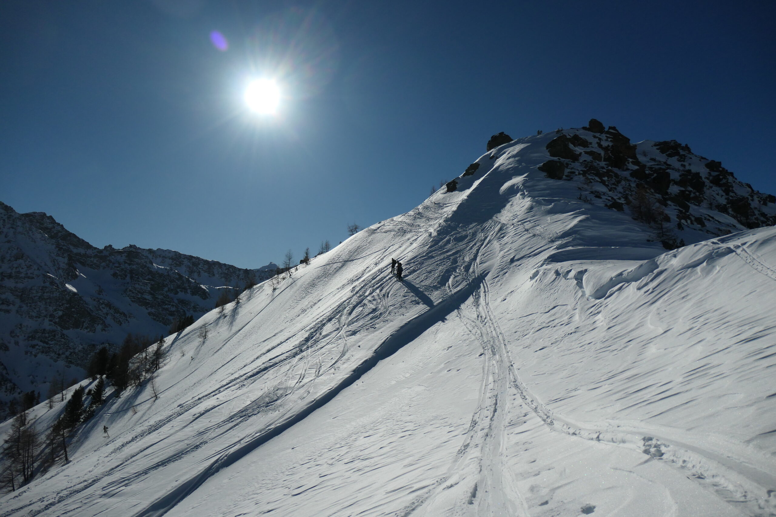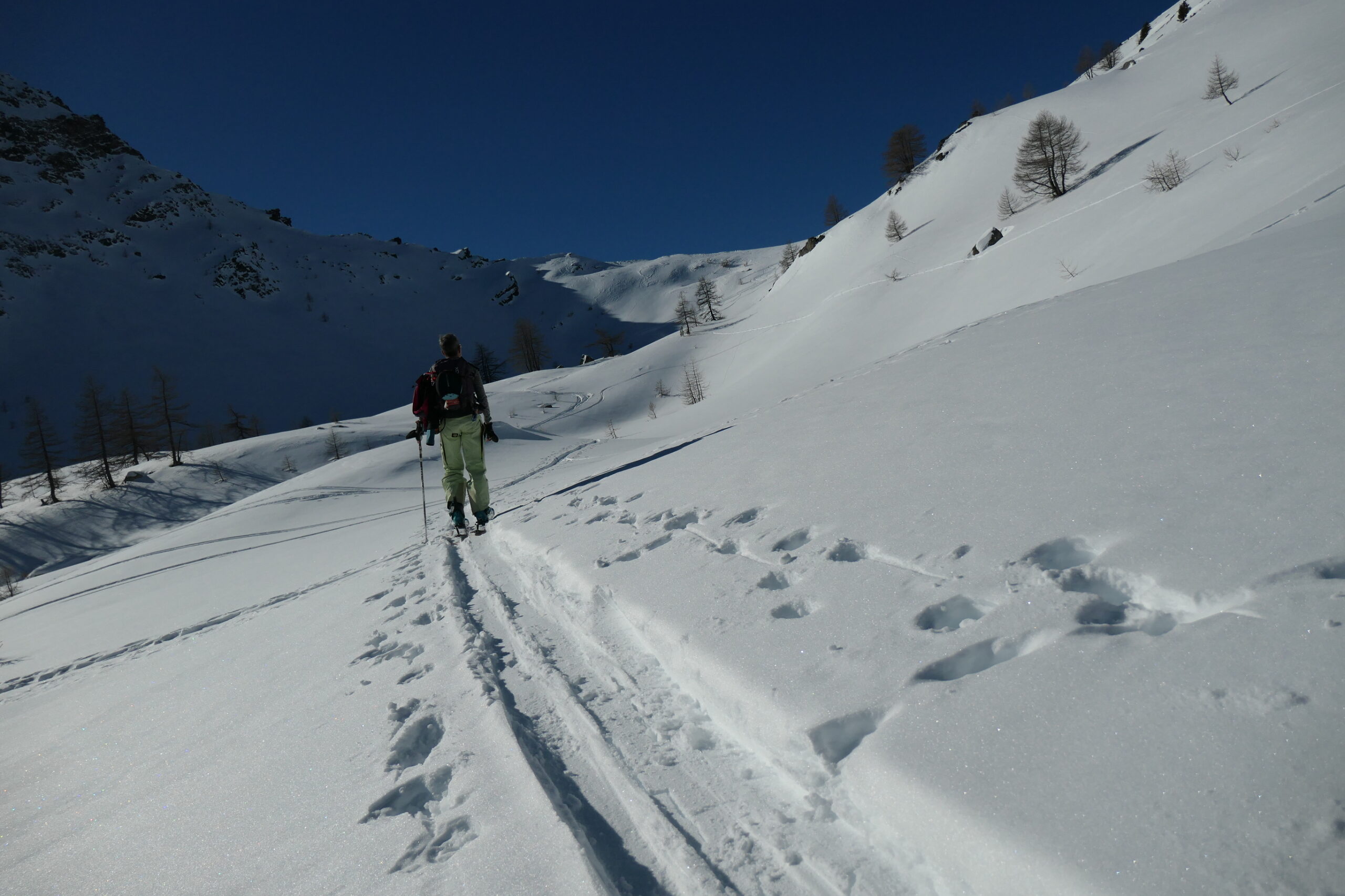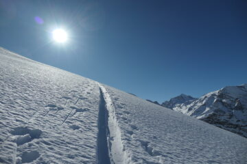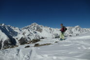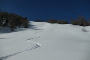Partiti per fare il Col Serena vediamo una bella traccia a destra al sole e la seguiamo. Raggiungiamo cosí il colletto sotto la Costa Nord…