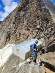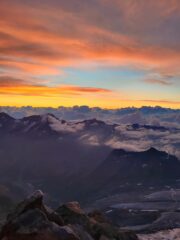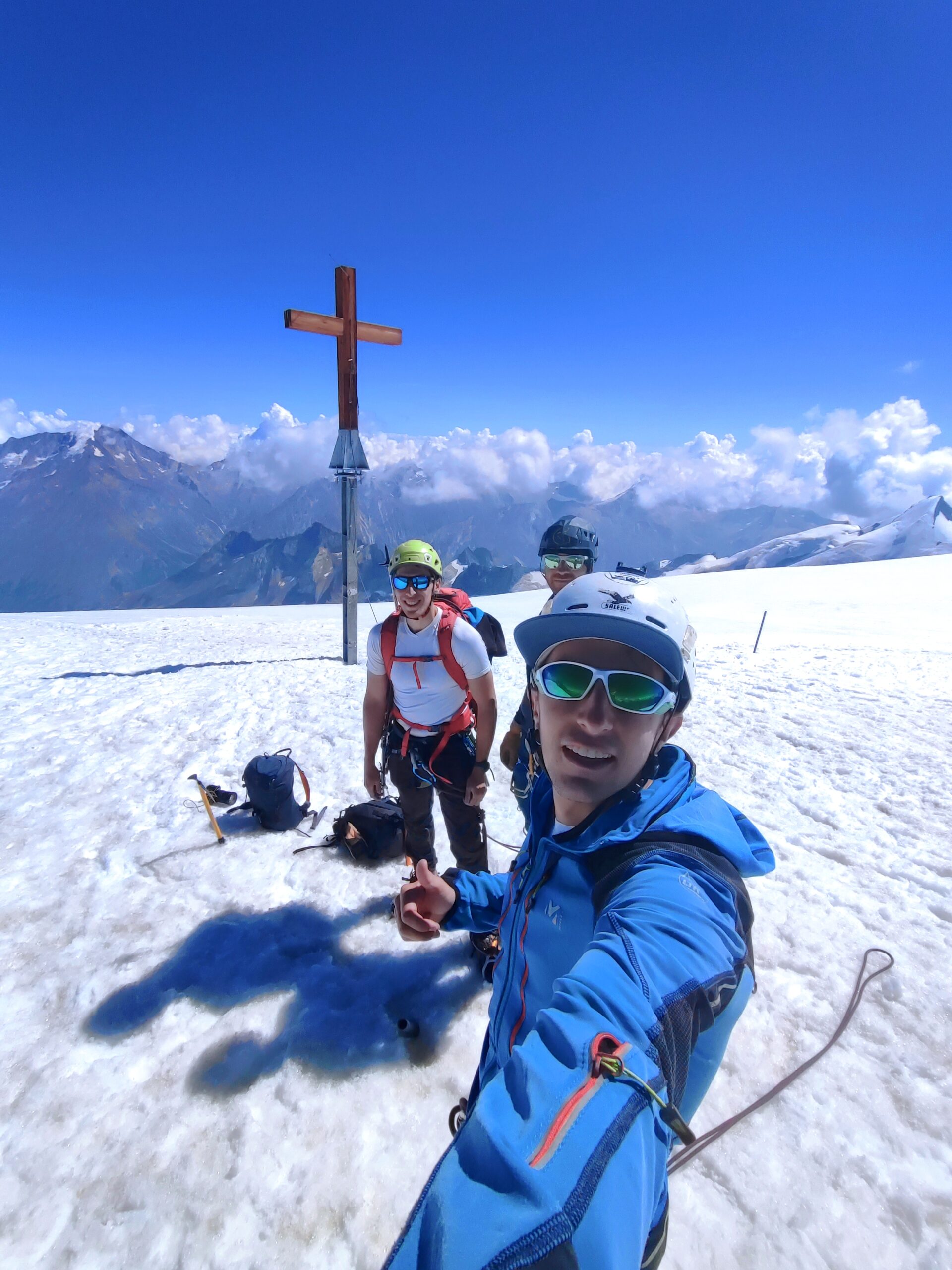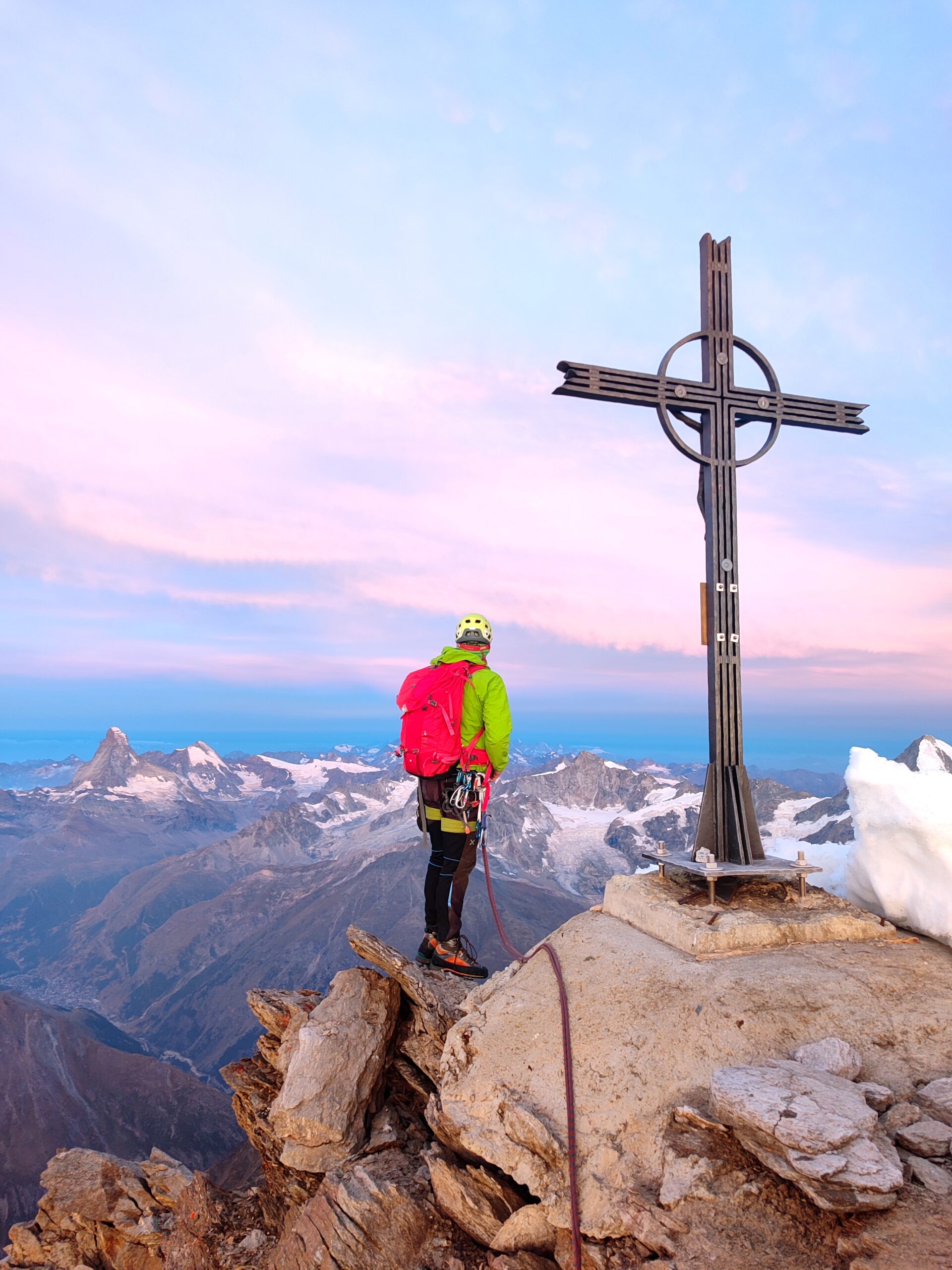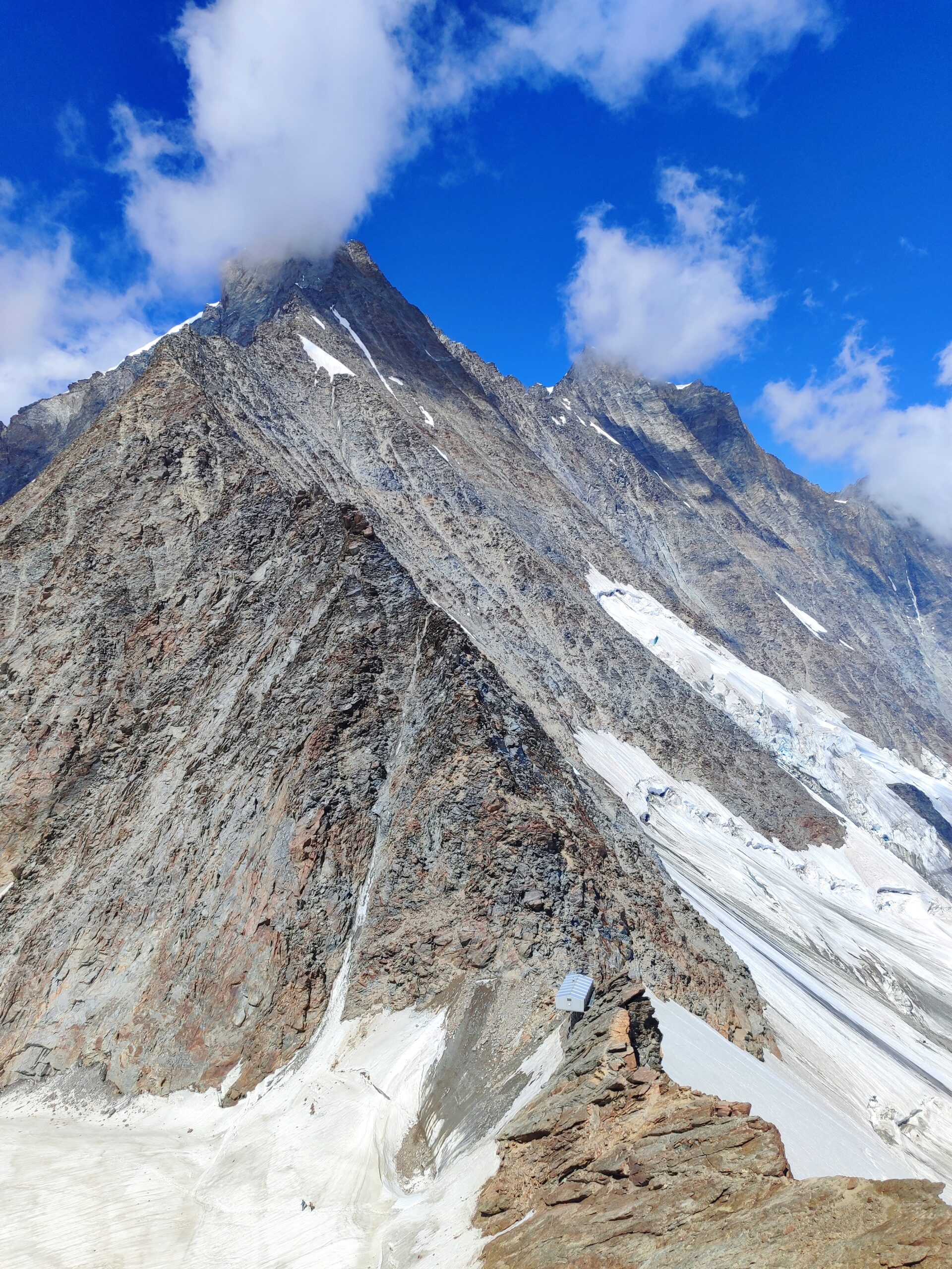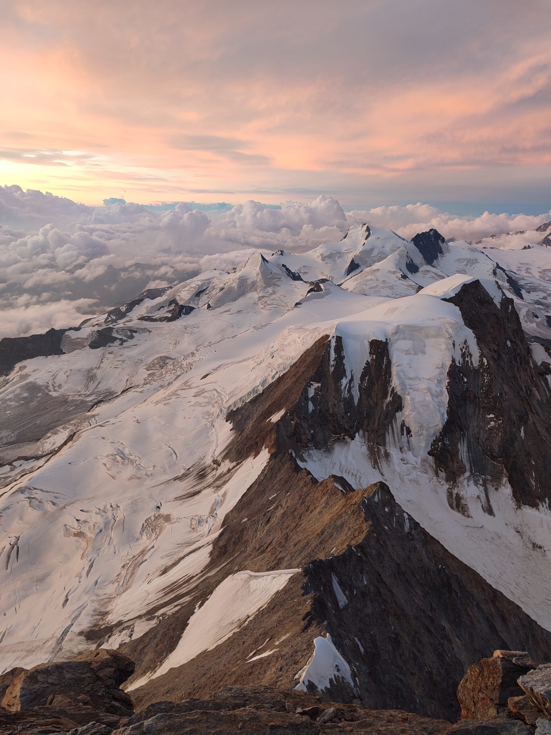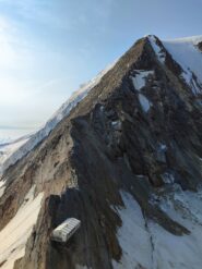 Dal Mischabeljochbiwak partiamo verso le 3. La cresta è completamente pulita, piccozza e ramponi non servono. Anche al buio si riesce quasi sempre a individuare…