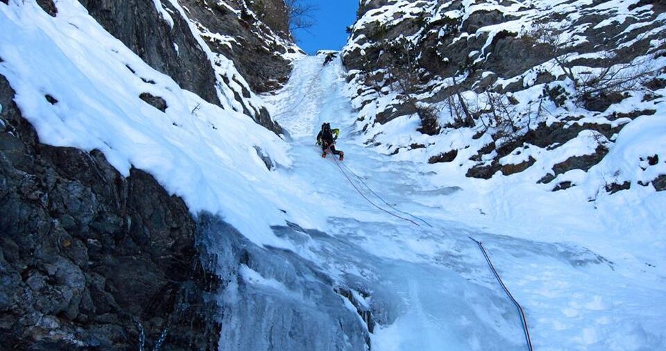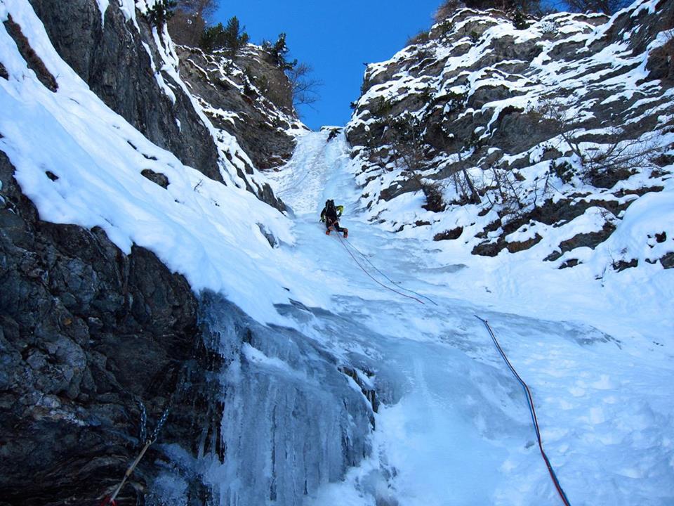 Ghiaccio buono nel primo tiro (fare attenzione alle eventuali scariche provenienti dalle cordate sul secondo tiro), sosta su albero con catena ed anello di calata. Nel…