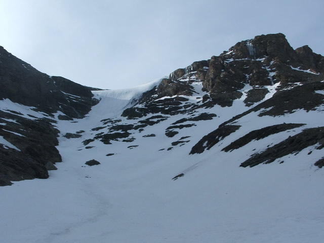 Giornata di nebbie che hanno impedito di gustare l'ottimo panorama. Temperatura elevata e neve molle nel canale, data l'esposizione.